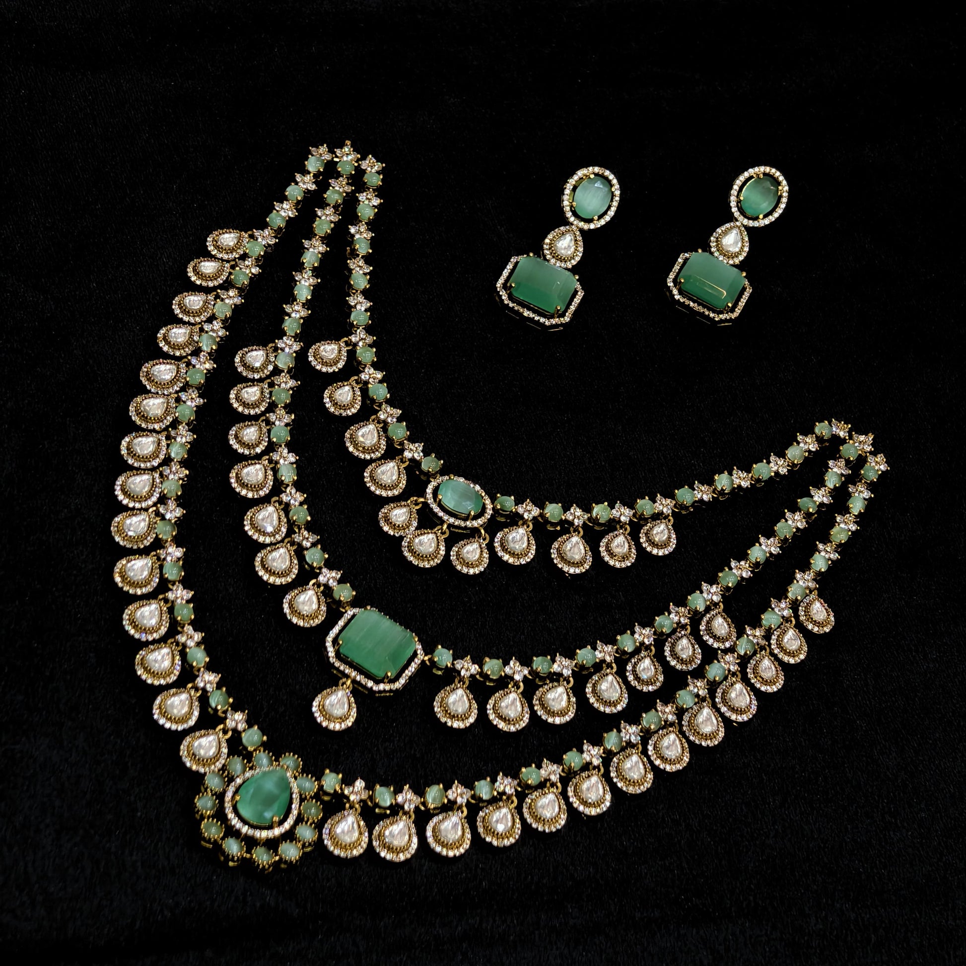 Victorian finish 3 layer neck set in light green colour.with earrings.gor for reception's and functions.