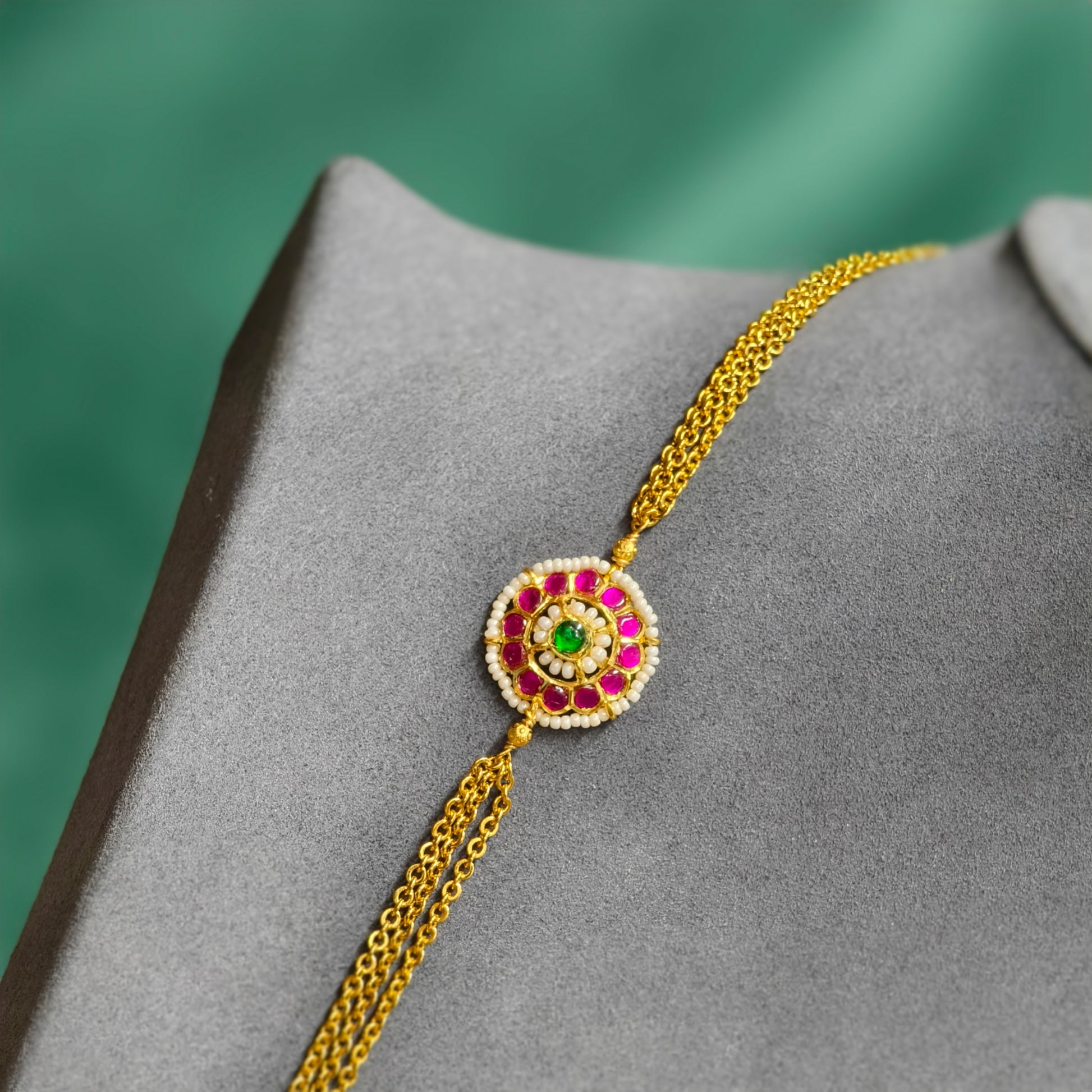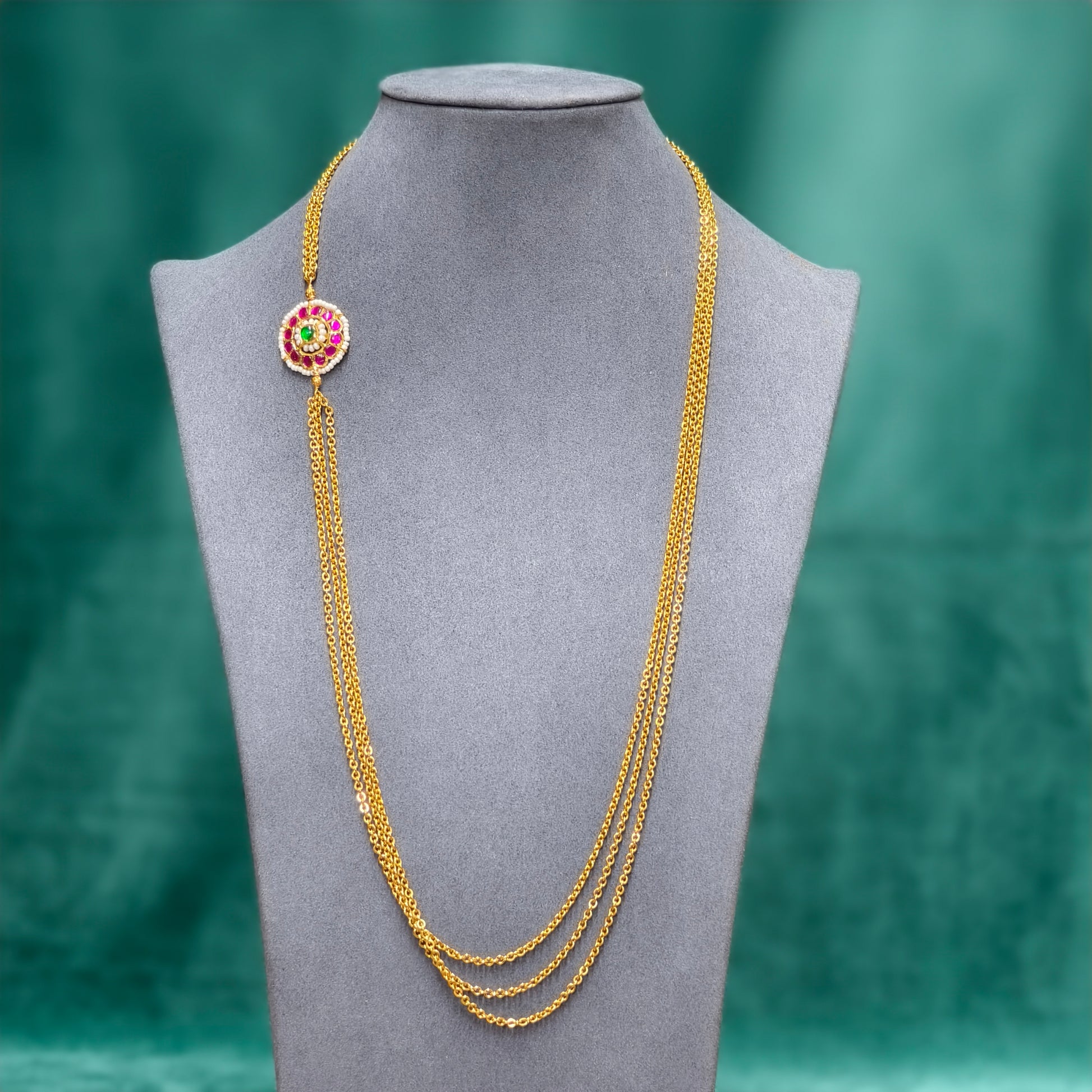 3 line chandraharam with flower pattern pendant.pink and white stone combination.traditional wear.