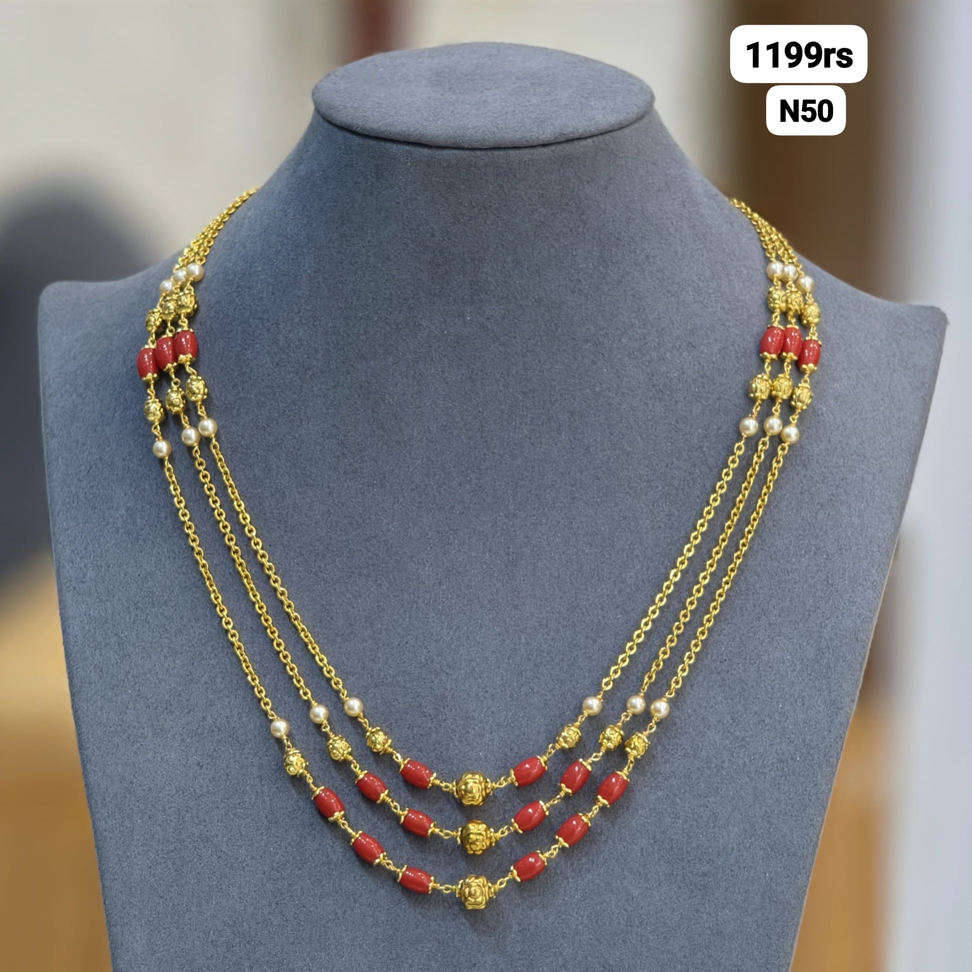 Elevate your traditional jewelry collection with this exquisite 3-line kempu haram, featuring lustrous gold balls that add sophistication to the classic design. The deep red kempu stones are expertly set to create a striking contrast with the gleaming gold accents, making this piece ideal for festive occasions and cultural celebrations. A timeless accessory that seamlessly blends heritage craftsmanship with refined elegance.