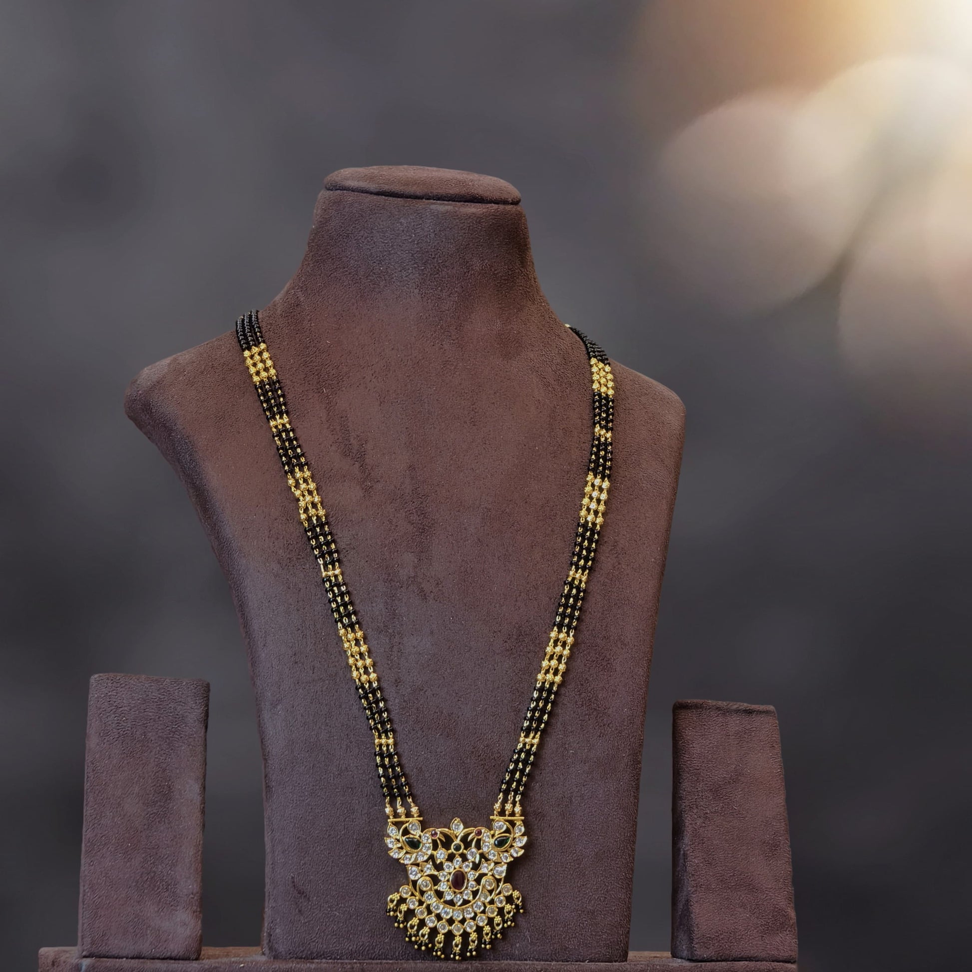 3 lines long black beads with beautiful peacock pattern pendant. In the length of 28 Inches.