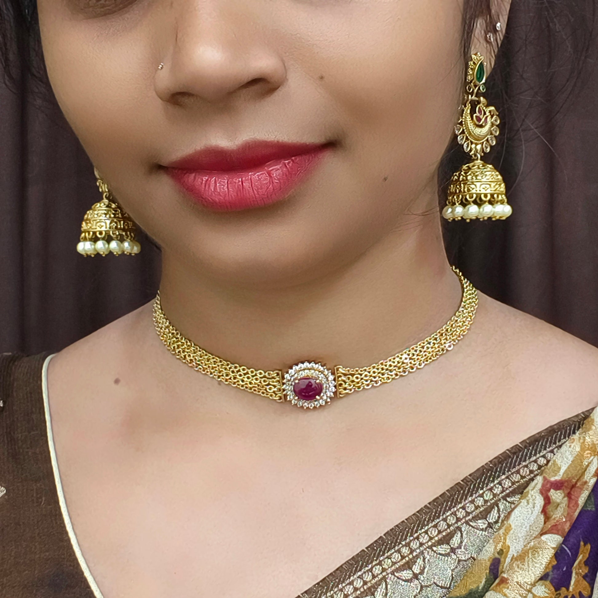Pink and white stone pendant with 4lines of chandraharam chain. Neck Chocker. Suitable for any others.