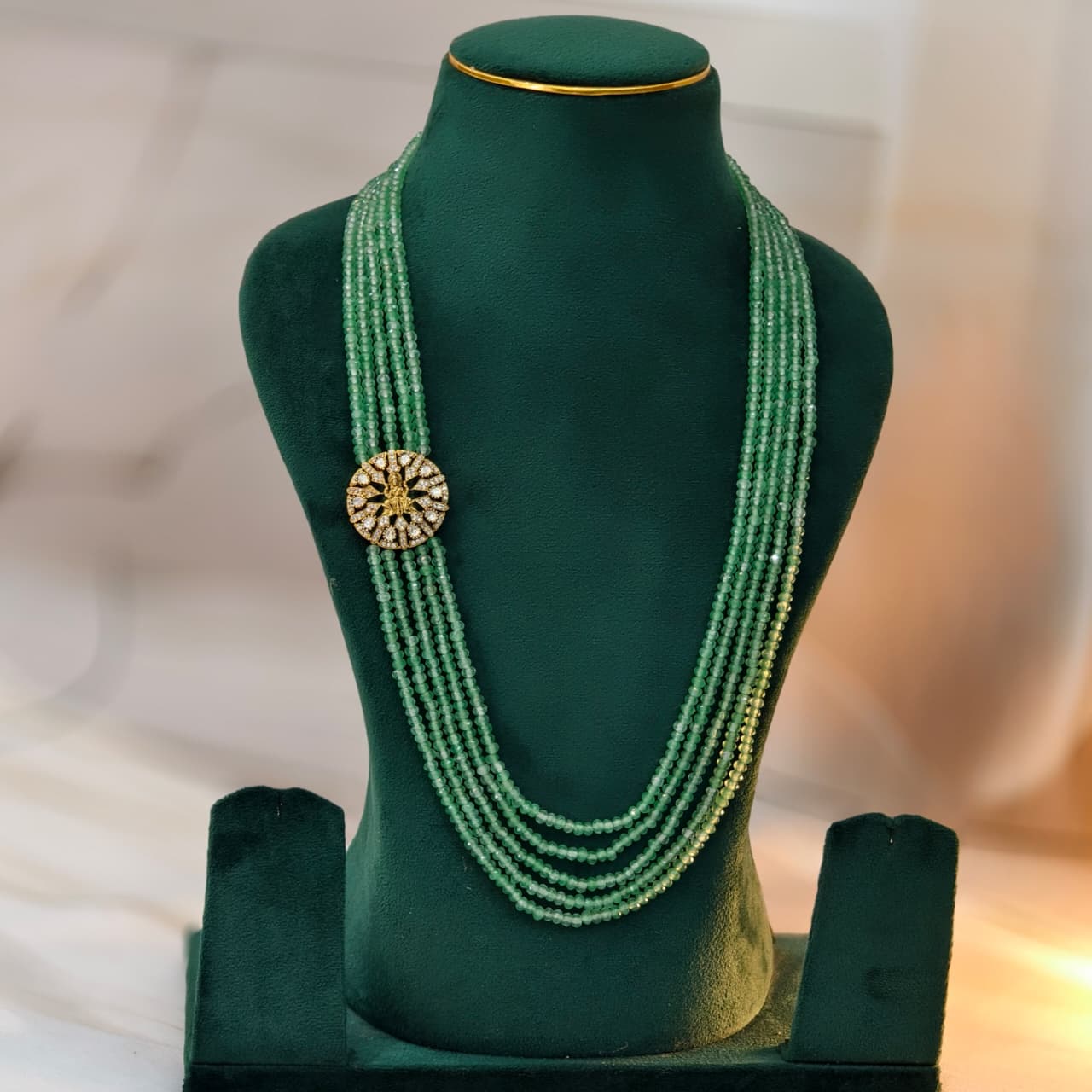 Light green beads. Pendant is Victorian dollar. Laxmi ammavari with round stones.