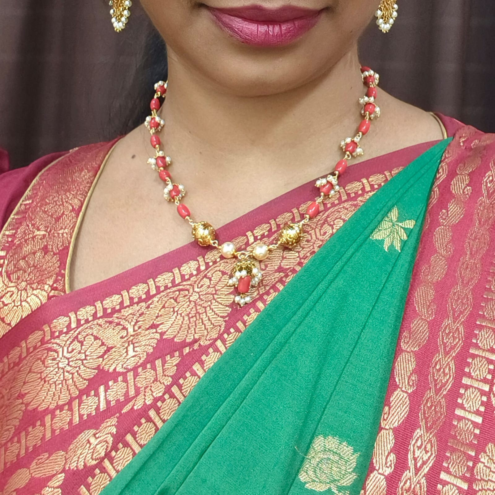 Short neck piece with nakshi golden beads and buttas in the length of 18 inches.