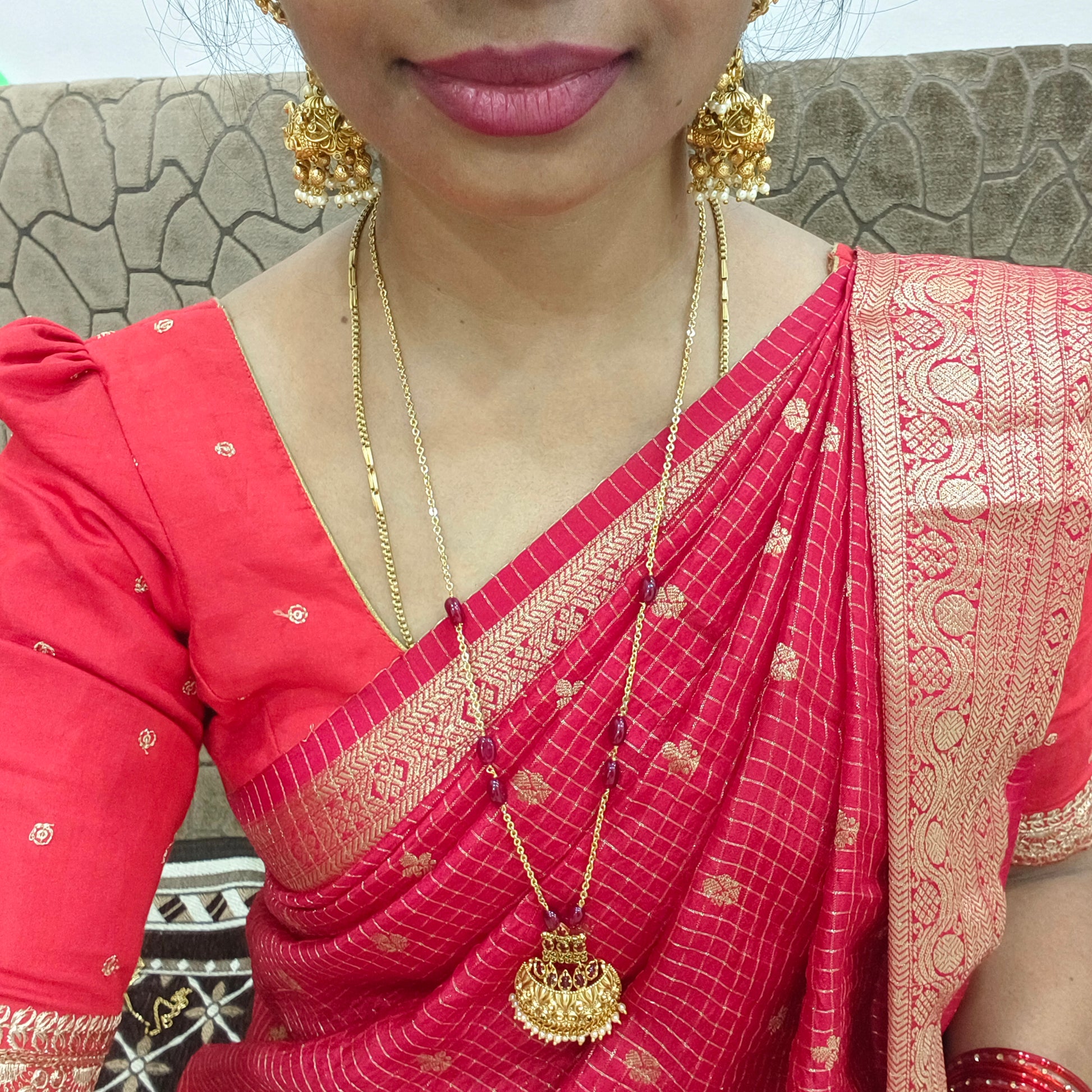 Antique Nakshi semi pendant with maroon beads chain. Approx 26 to 27 inches.