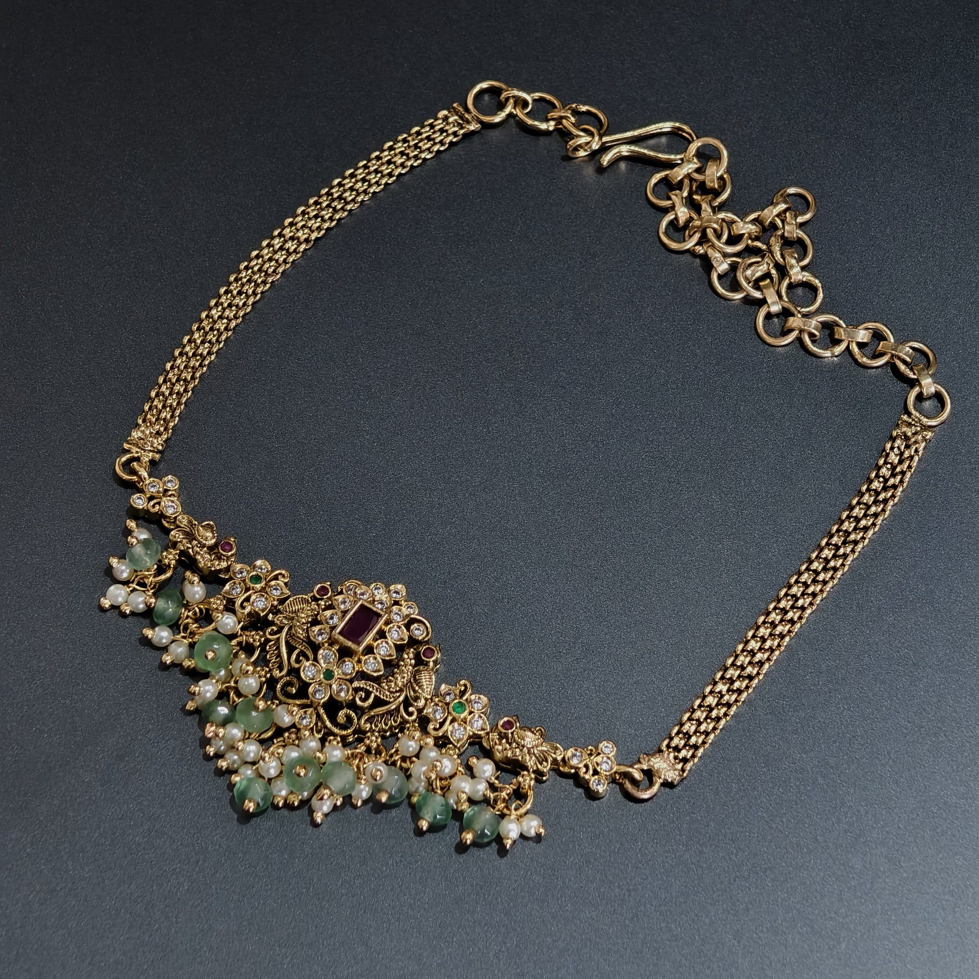 Short neck set in antique finishing with back chain.flower pattern and light green beads combination.