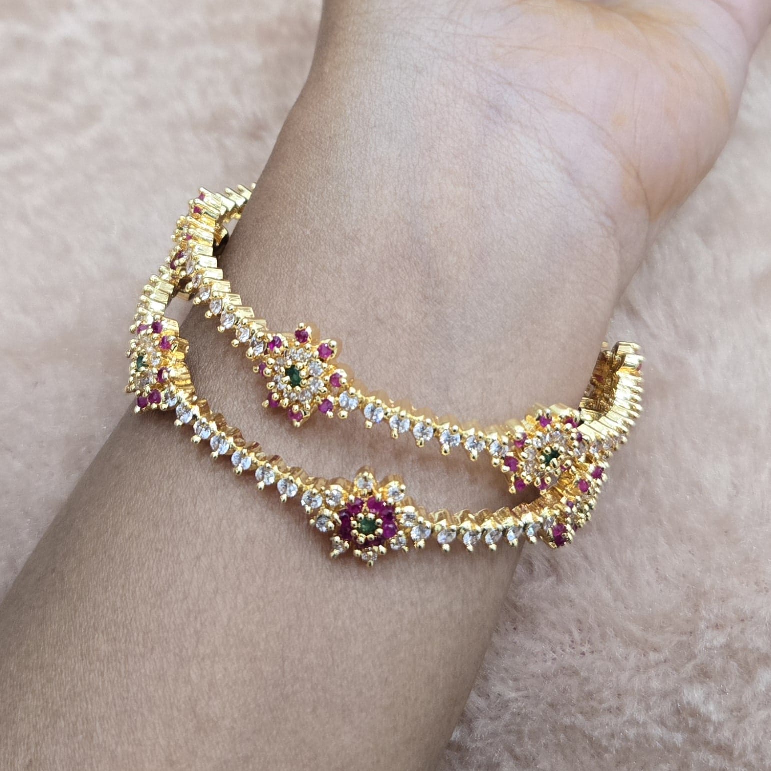 Stone work bangles with pink ,green and white stone work in flower pattern.