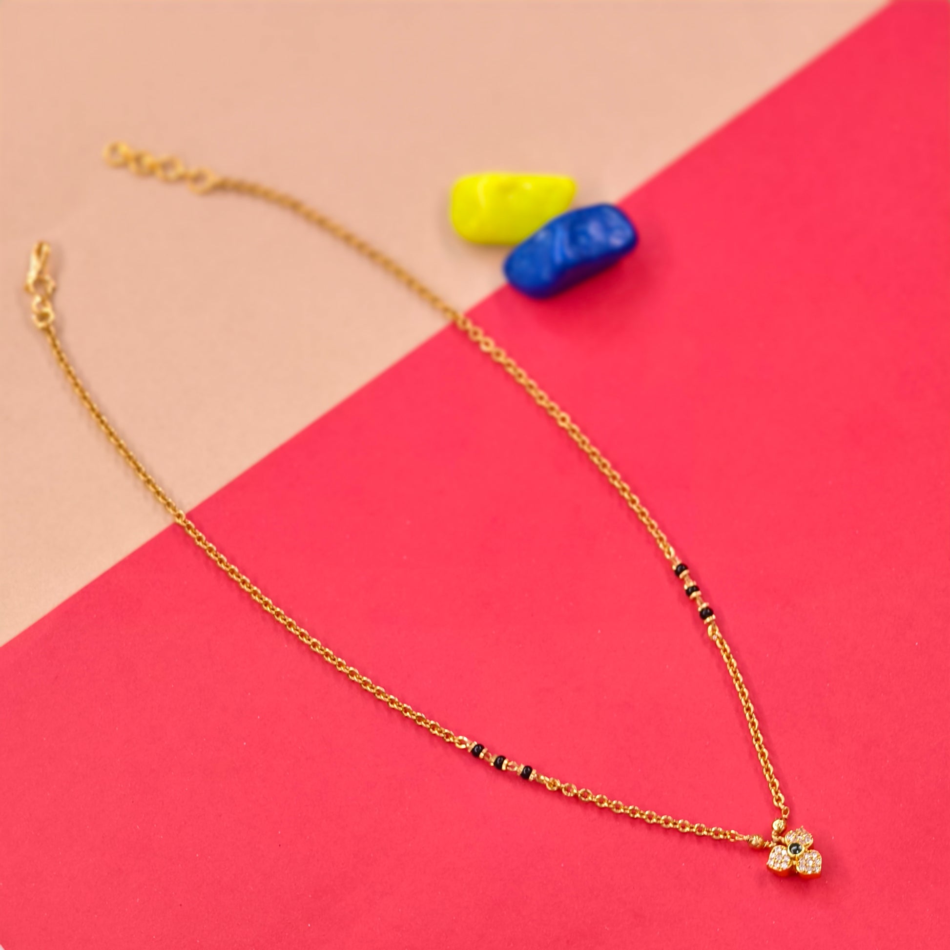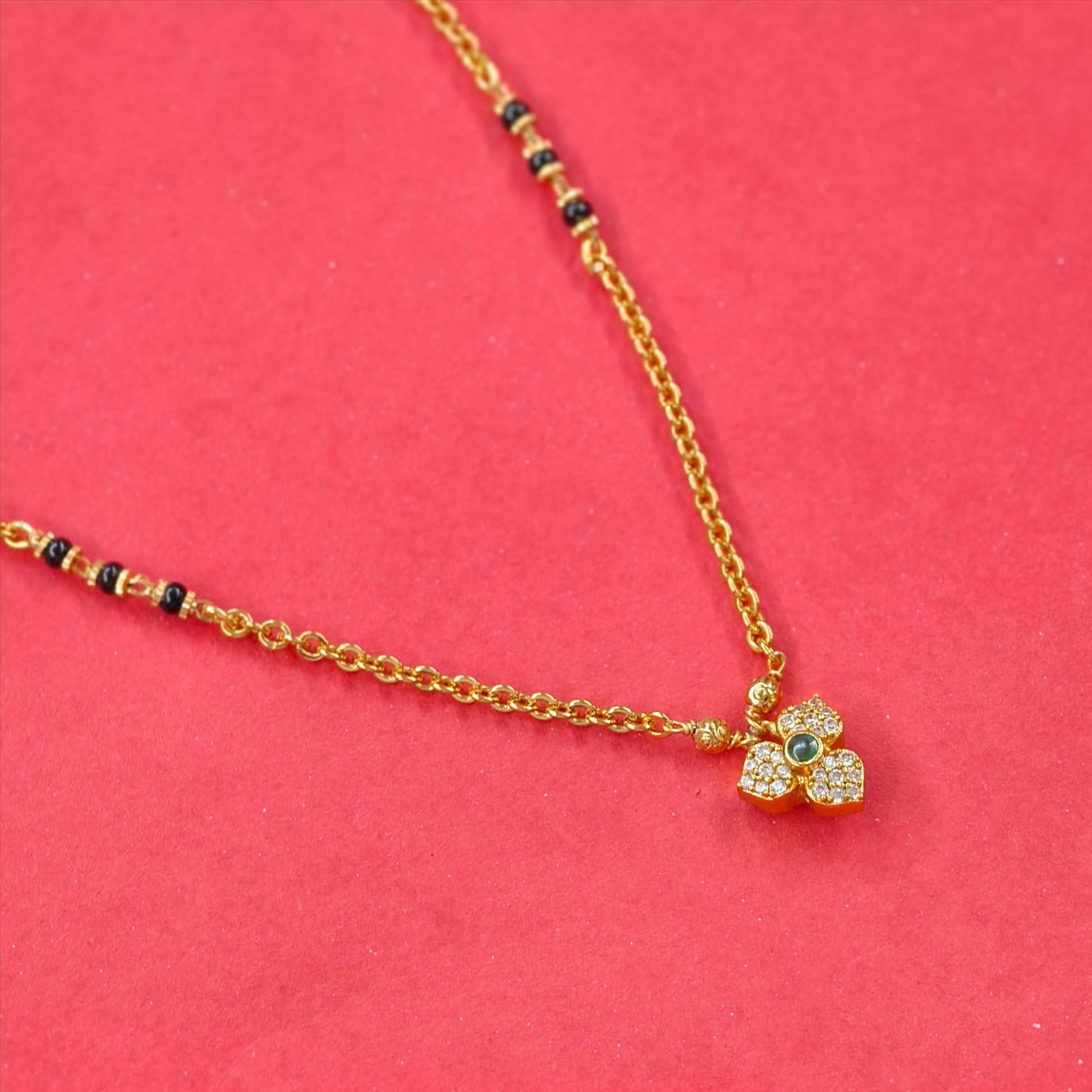 Three petal dollar. Green and white stone combination pendant. Simple black beads. In the length of 16 inch. In micro gold finishing.