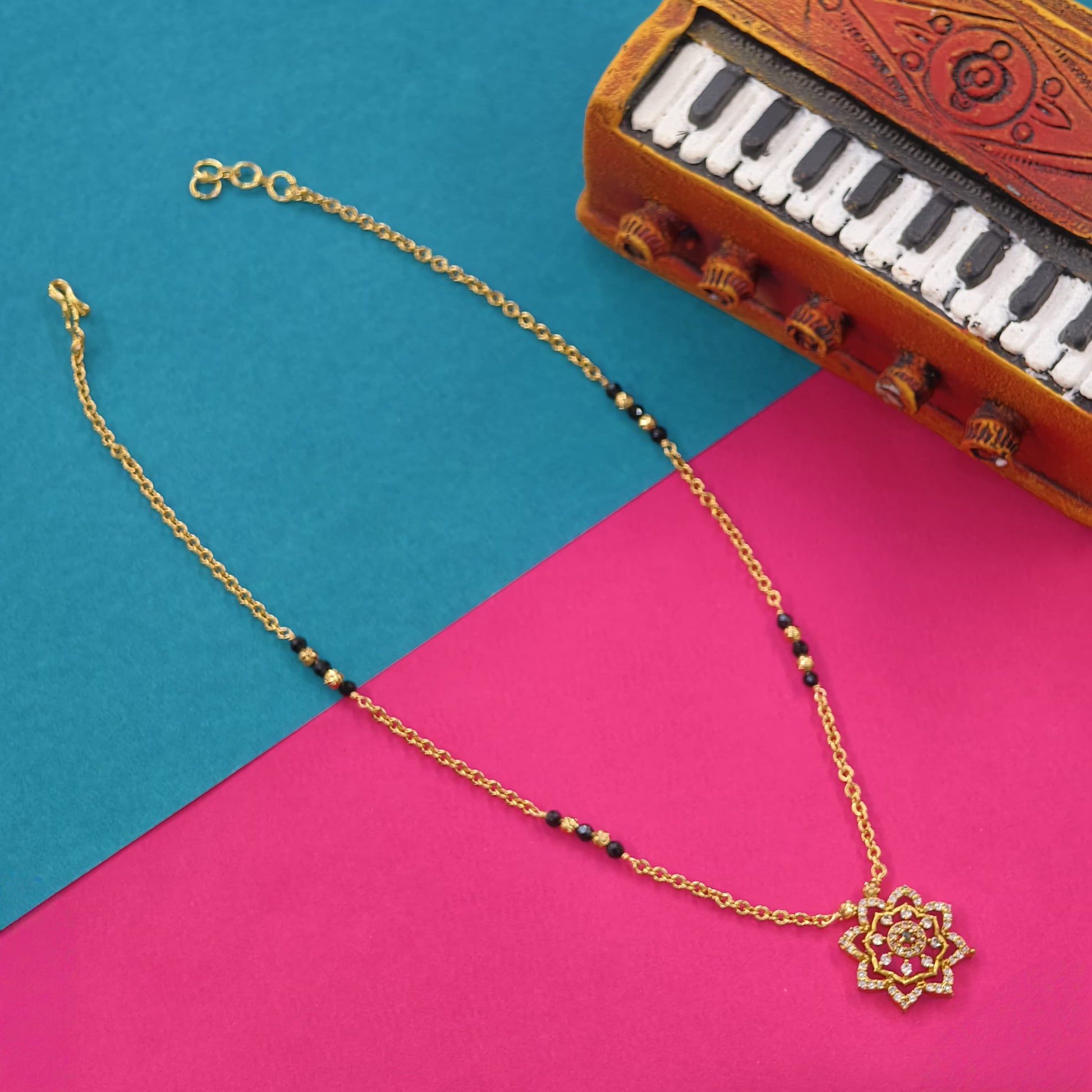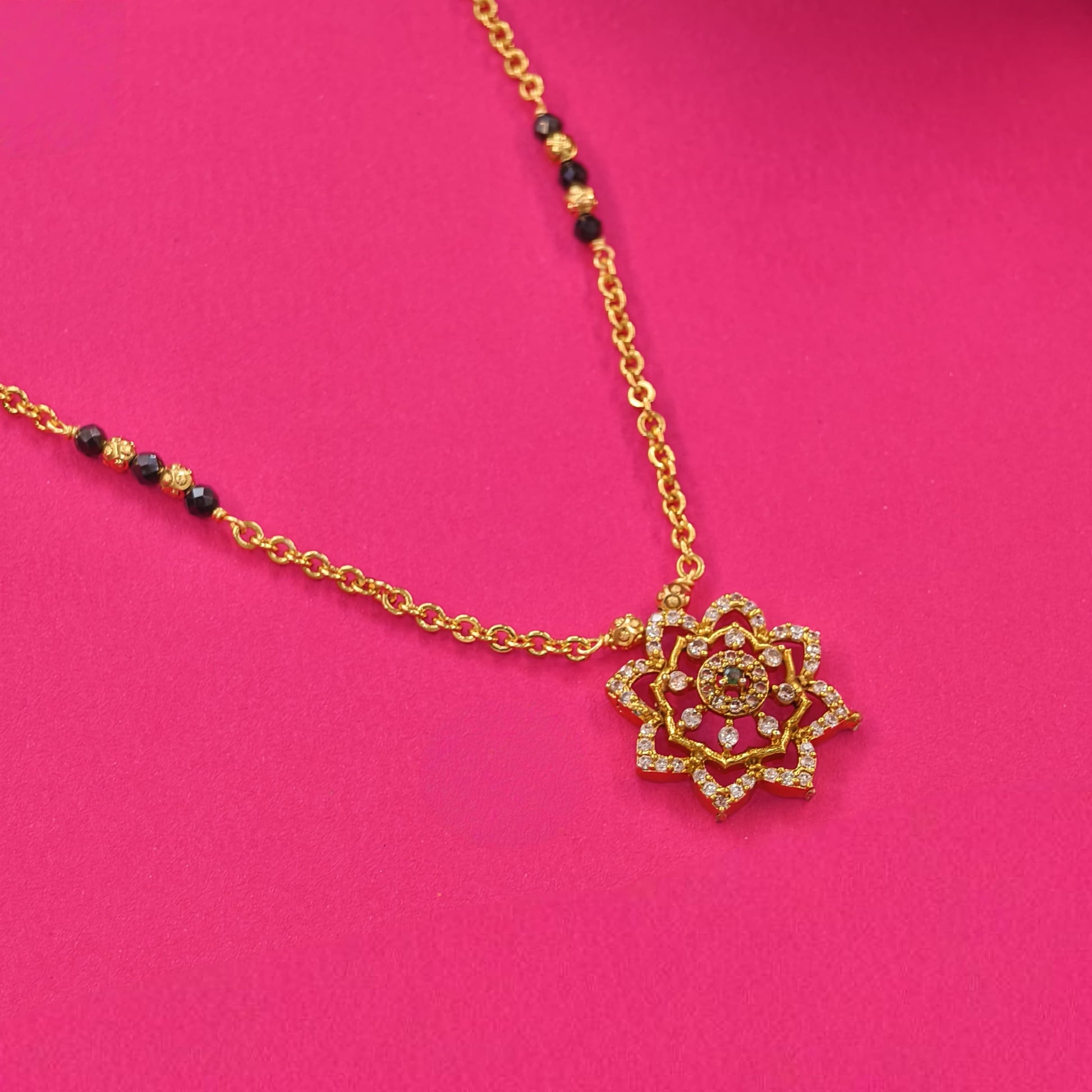 Short black beads with flower pattern pendant.in the length of 16 inches.