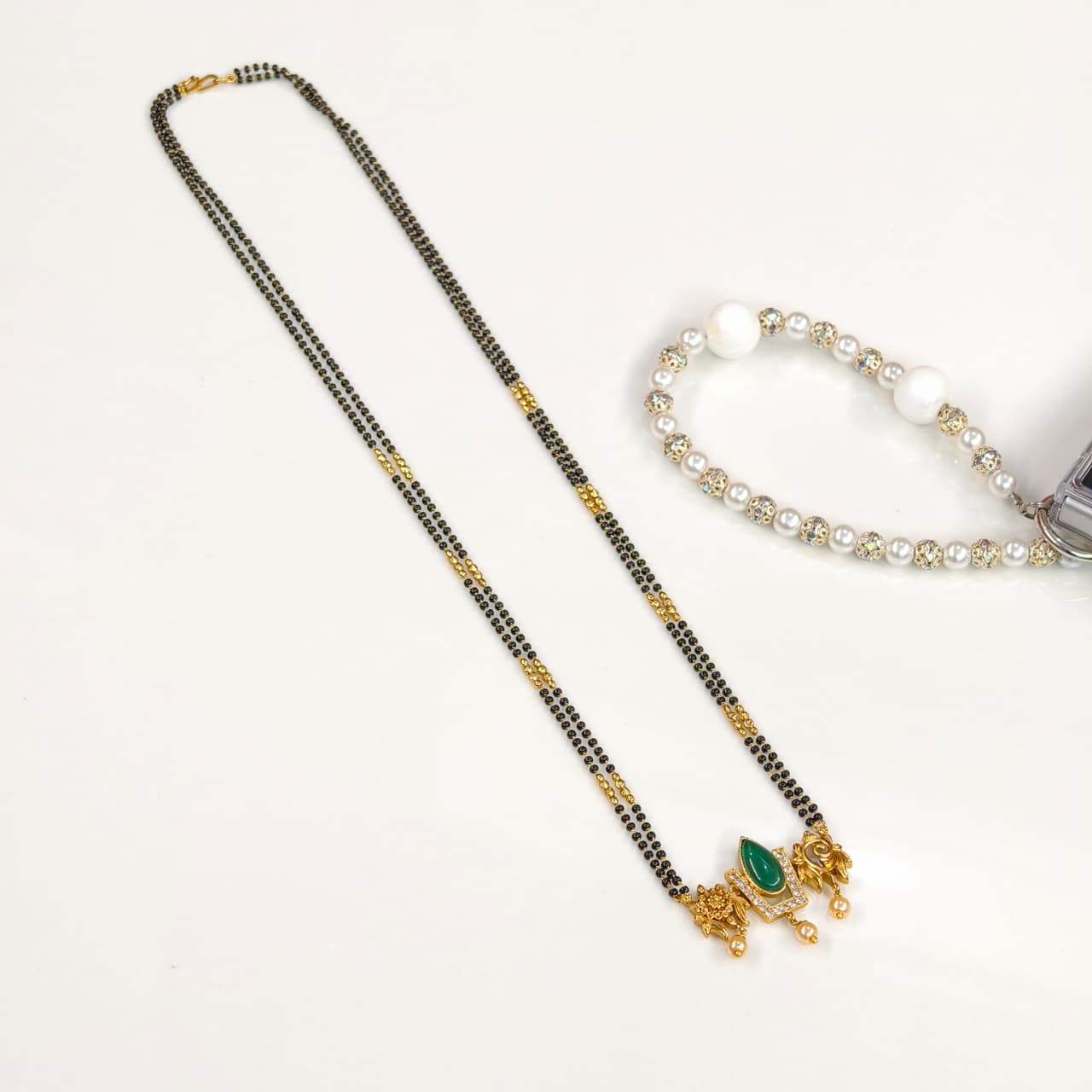 Long thirunamala black beads with green stone pendant.Traditional wear.for Pooja's..