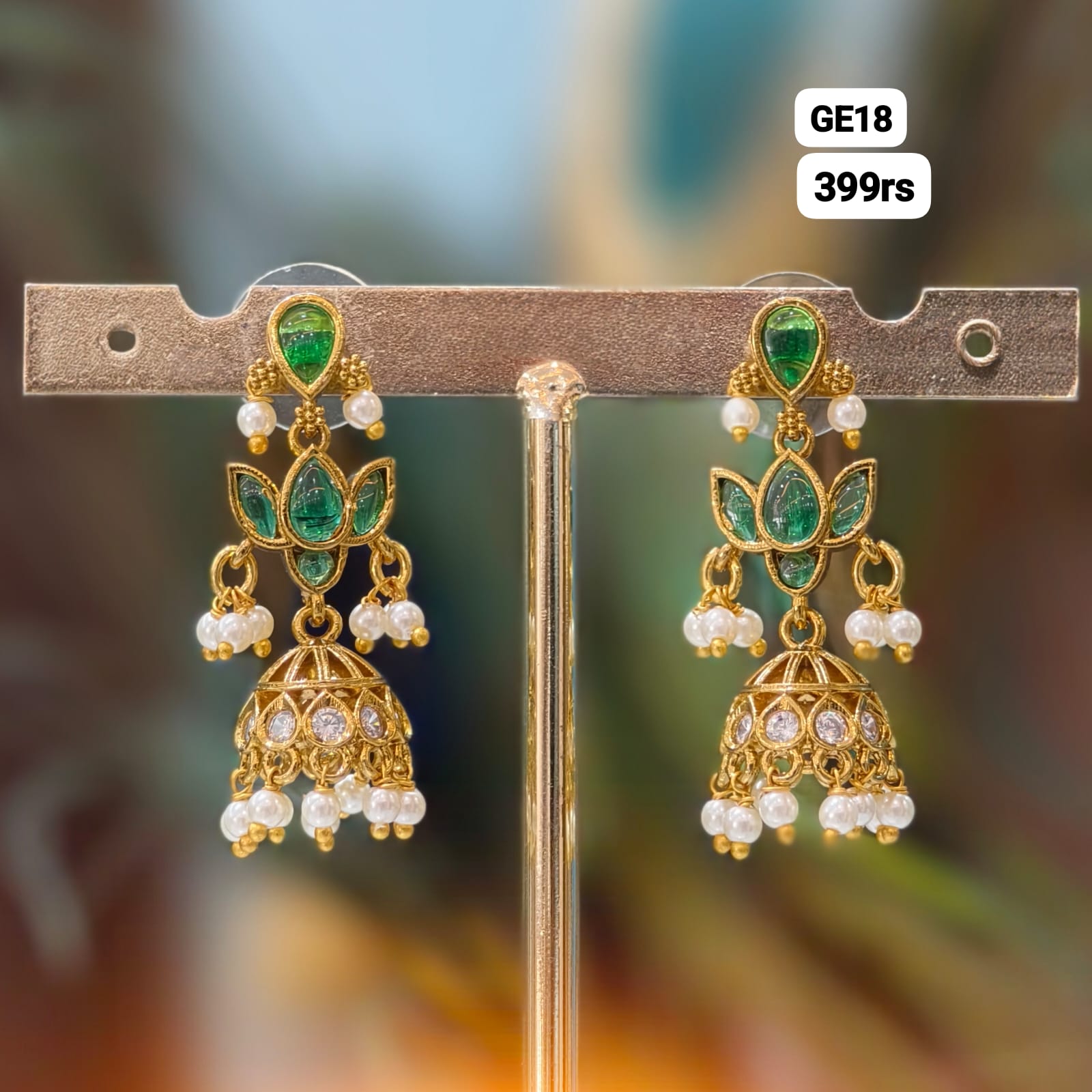 Elevate your traditional jewelry collection with these exquisite Butta earrings, featuring a classic circular design adorned with a vibrant green stone. The butta motif, a timeless element in Indian jewelry, brings sophistication and cultural elegance to any ensemble. The luminous green stone catches light beautifully, adding depth and visual interest to your look. Perfect for festive occasions, celebrations, or everyday wear, these earrings seamlessly blend heritage craftsmanship with contemporary style. Lightweight and comfortable for extended wear, they're an ideal choice for those who appreciate authentic imitation jewelry with refined aesthetics.