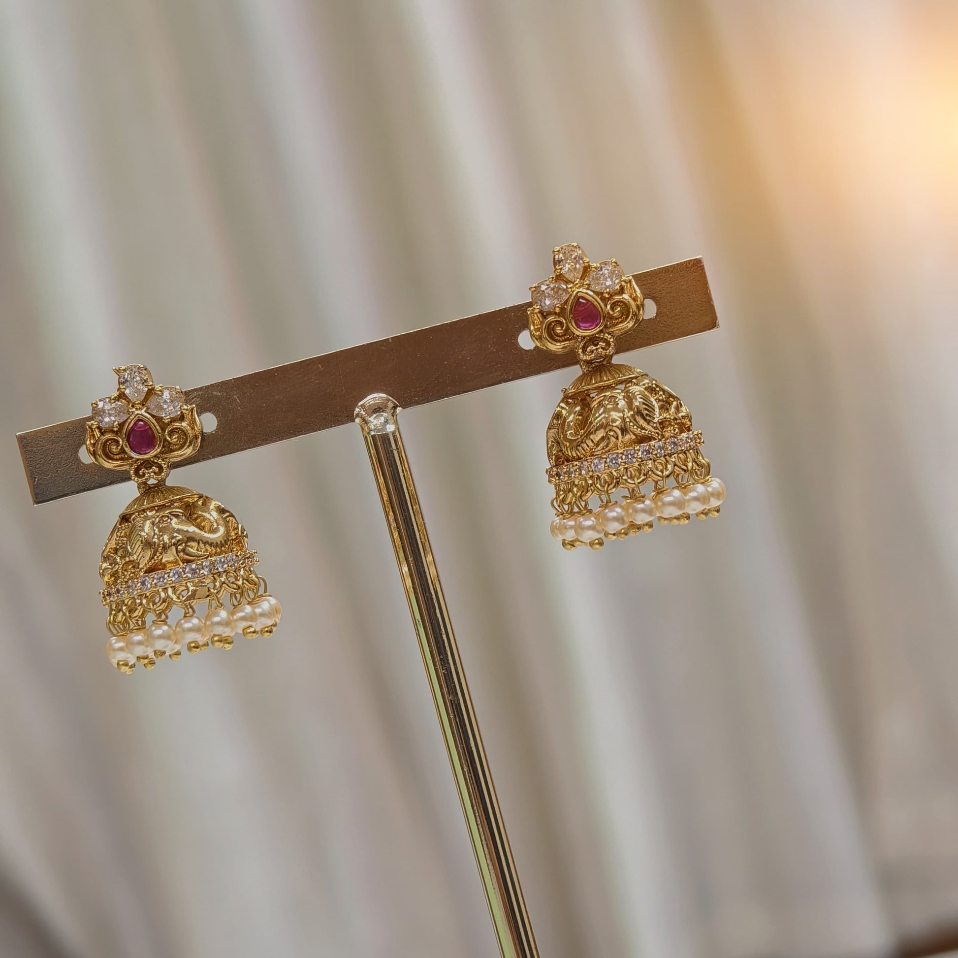 Pink stone Elephant pattern Earrings.back side Carving work.