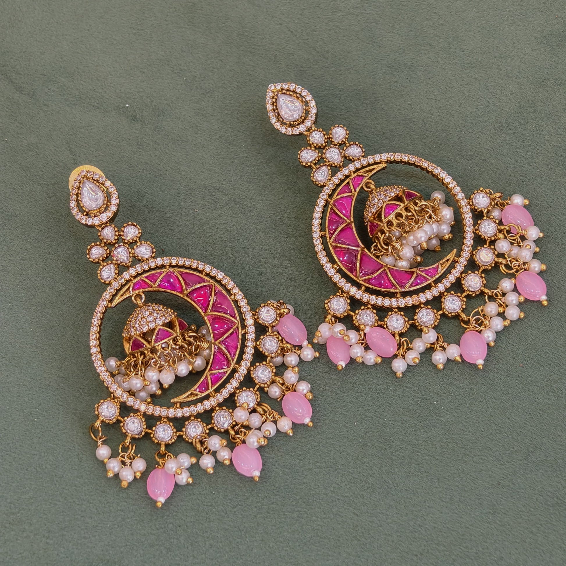Beautiful new pattern chandbali earrings. Kempu and white stone combination with light pink beads.for any occasion and functions.