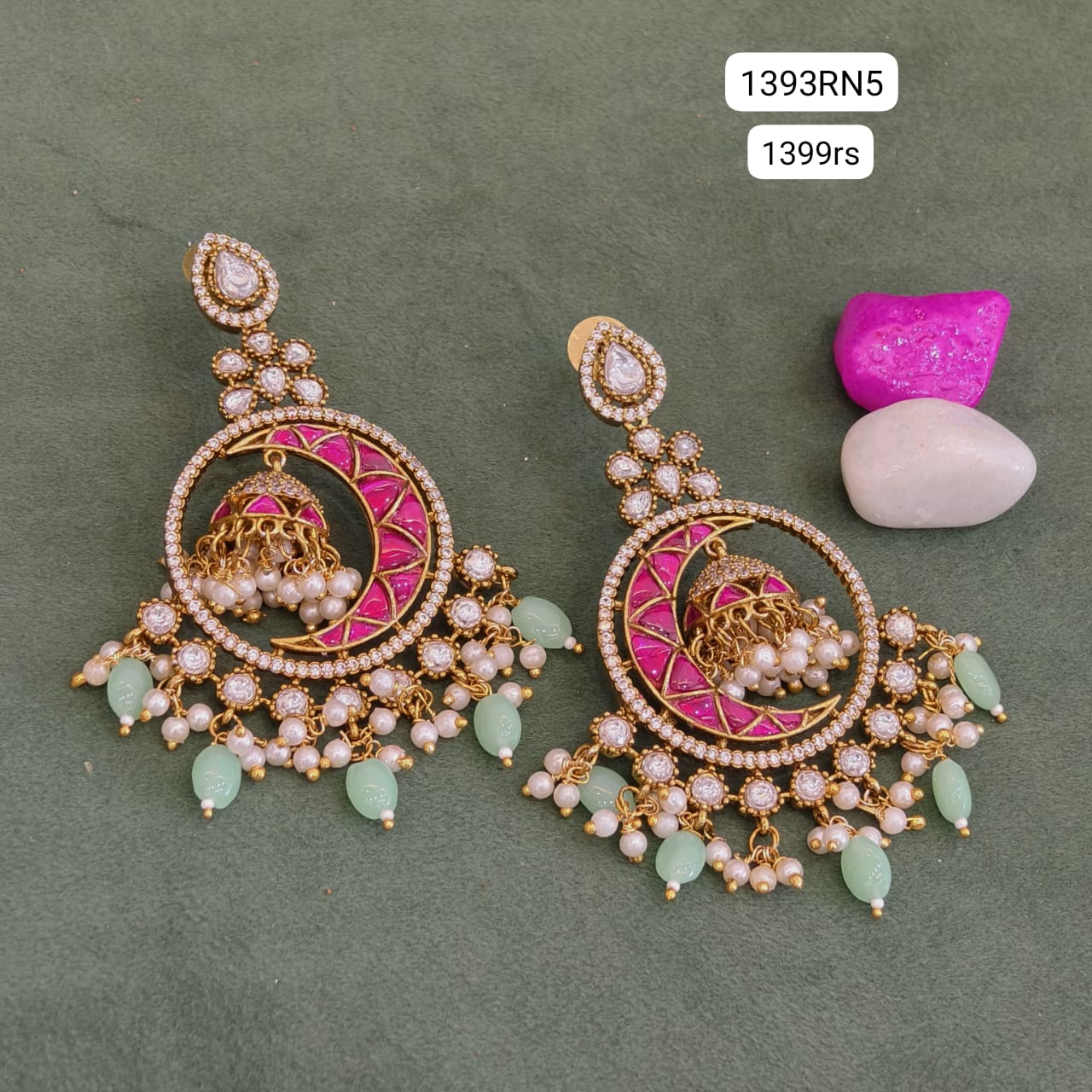 New pattern chandbali earrings.half moon design with pink stone and light green combination beads.for occasions and functions.