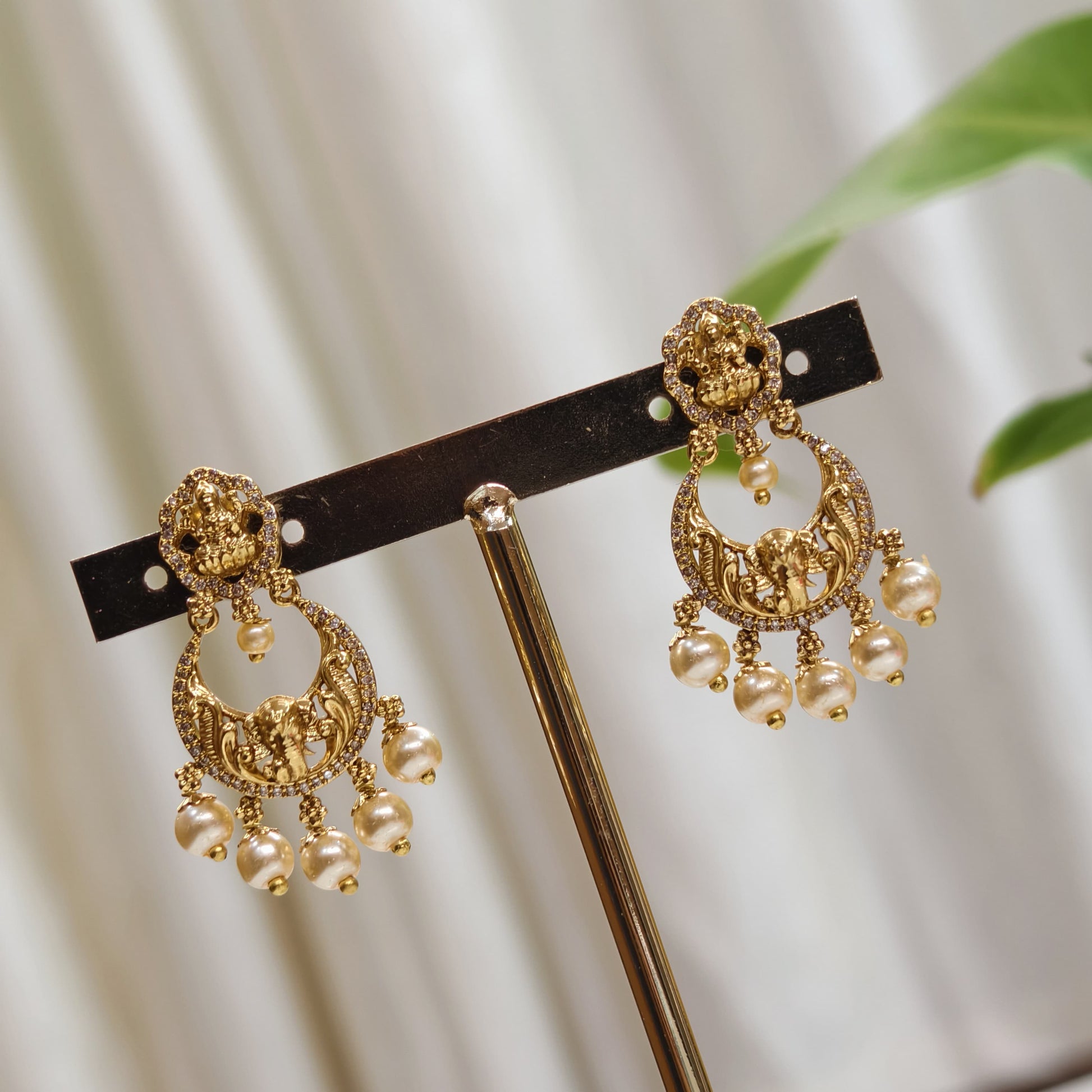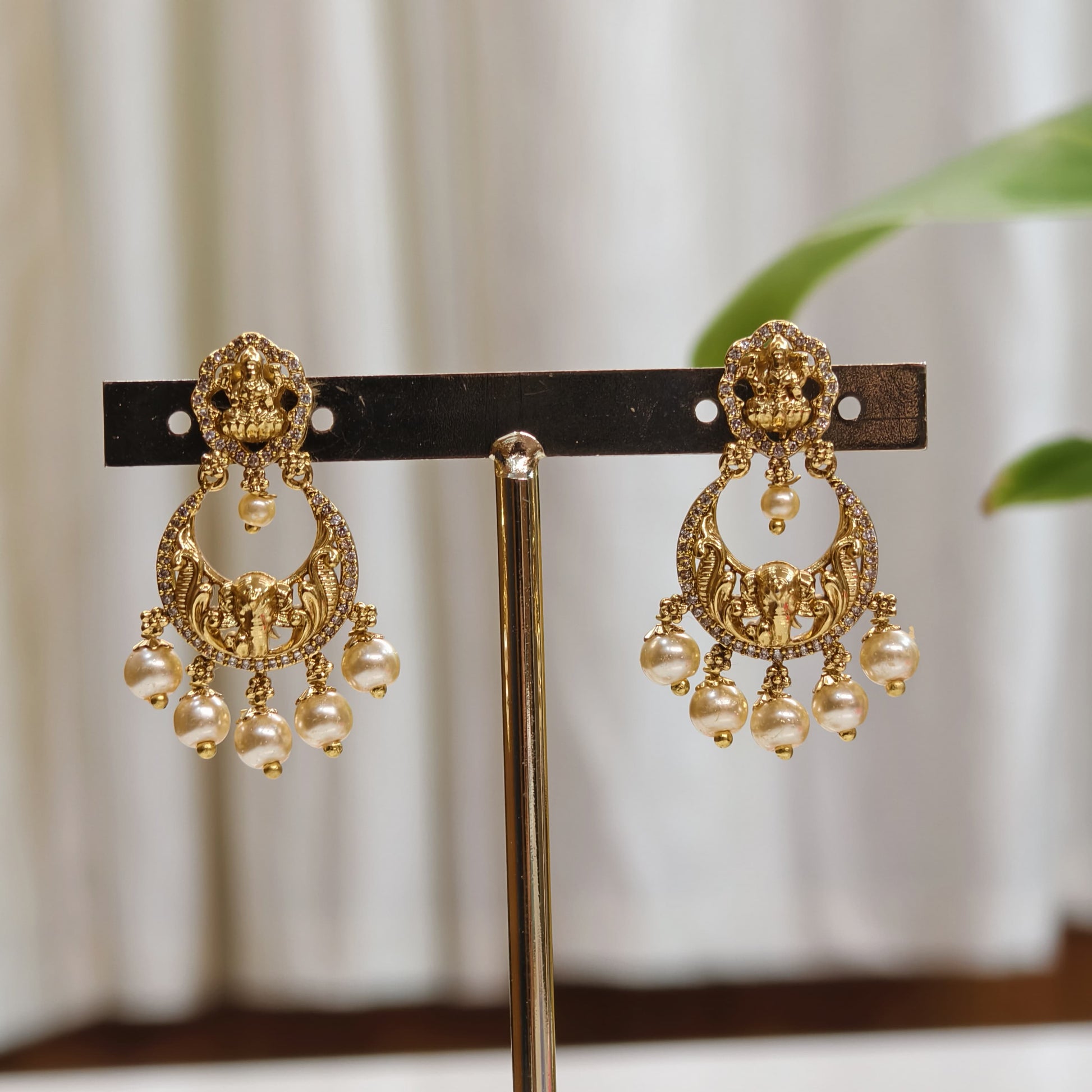 Chandbali Earrings in perfect size,finishing,carving with fine stonework god motive and premium quality bead droppings.