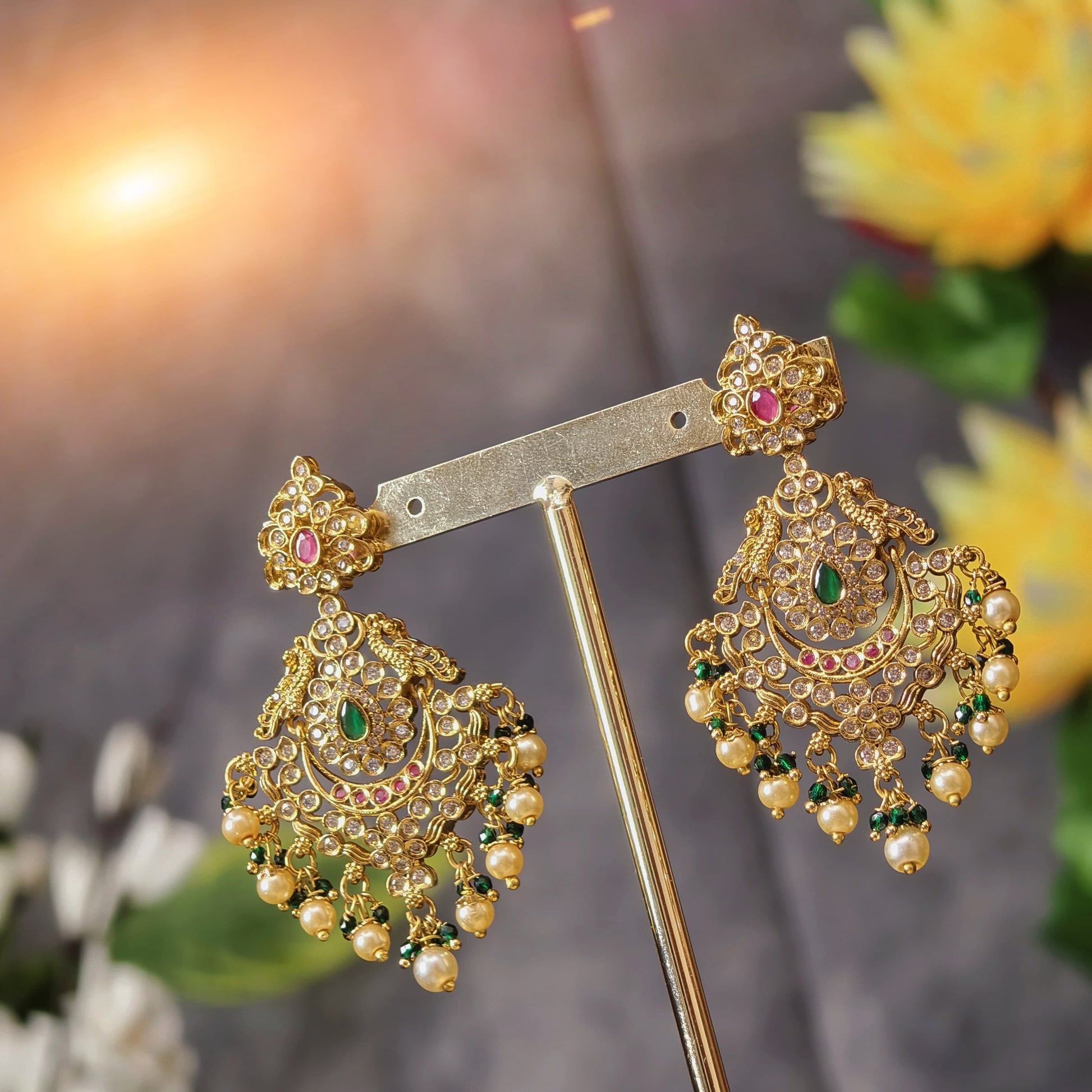 A grand, crescent - shaped chandbali design embellished with shimmering white stones and a green teardrop stone at the centre,symbolizing prosperity and elegance.
