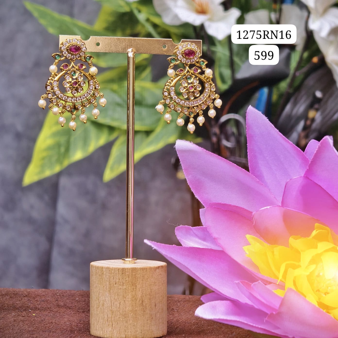 Flower pattern chandbali Earrings white,green and pink stone combination with pearl hangings.for functions