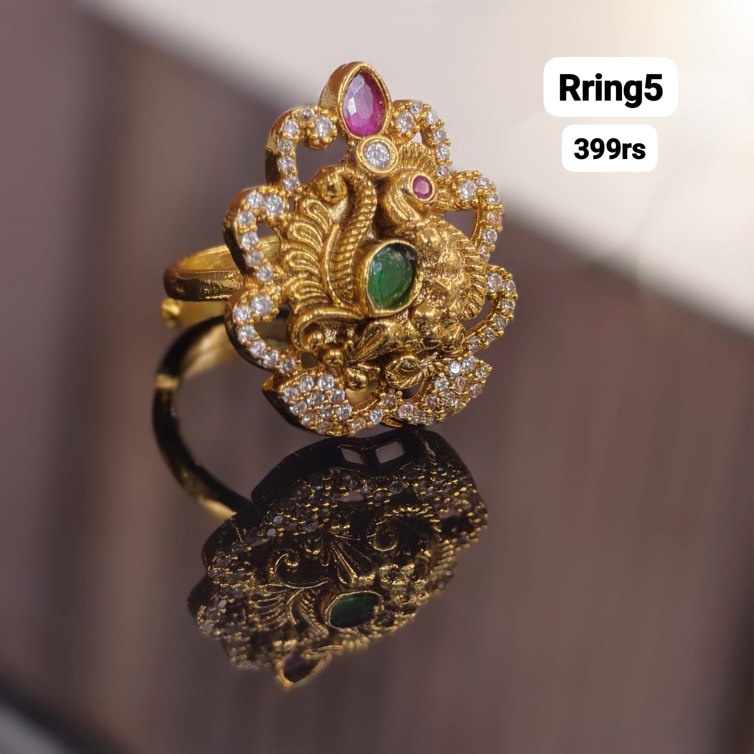 Nakshi finishing finger ring.peacock pattern.pink and green stone combination.