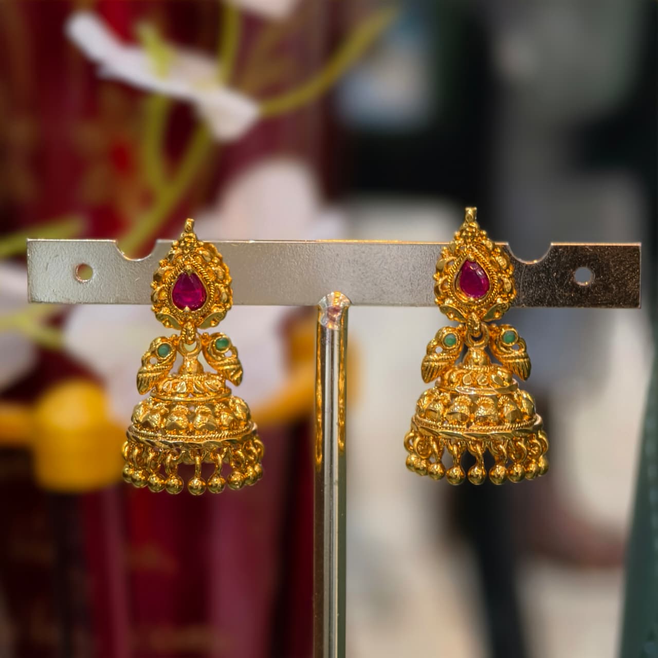 Micro gold finishing gold butta earrings.easy to wear easy to remove.pink and green stone combination.back side push back.