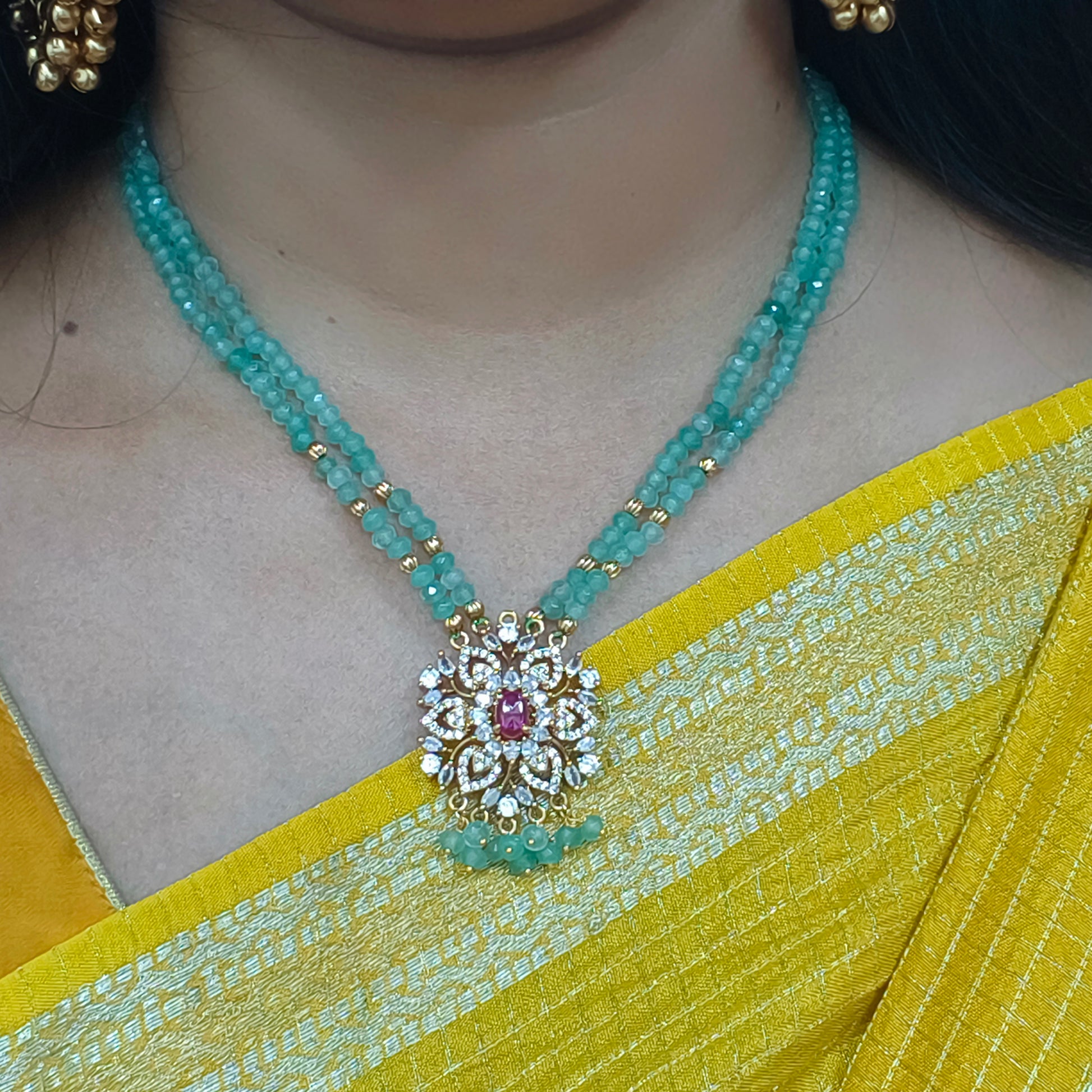 2lines of Green Onex beads with cz stones and real kempu stone pendant.