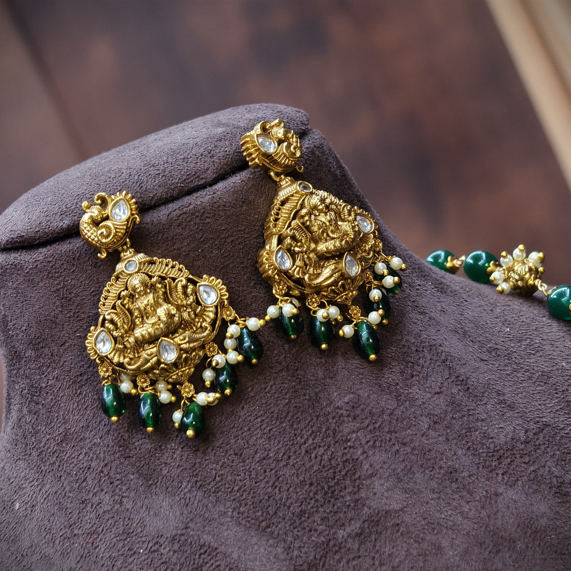 Green beads chain with Laxmi pendant.with earrings.for functions and parties.