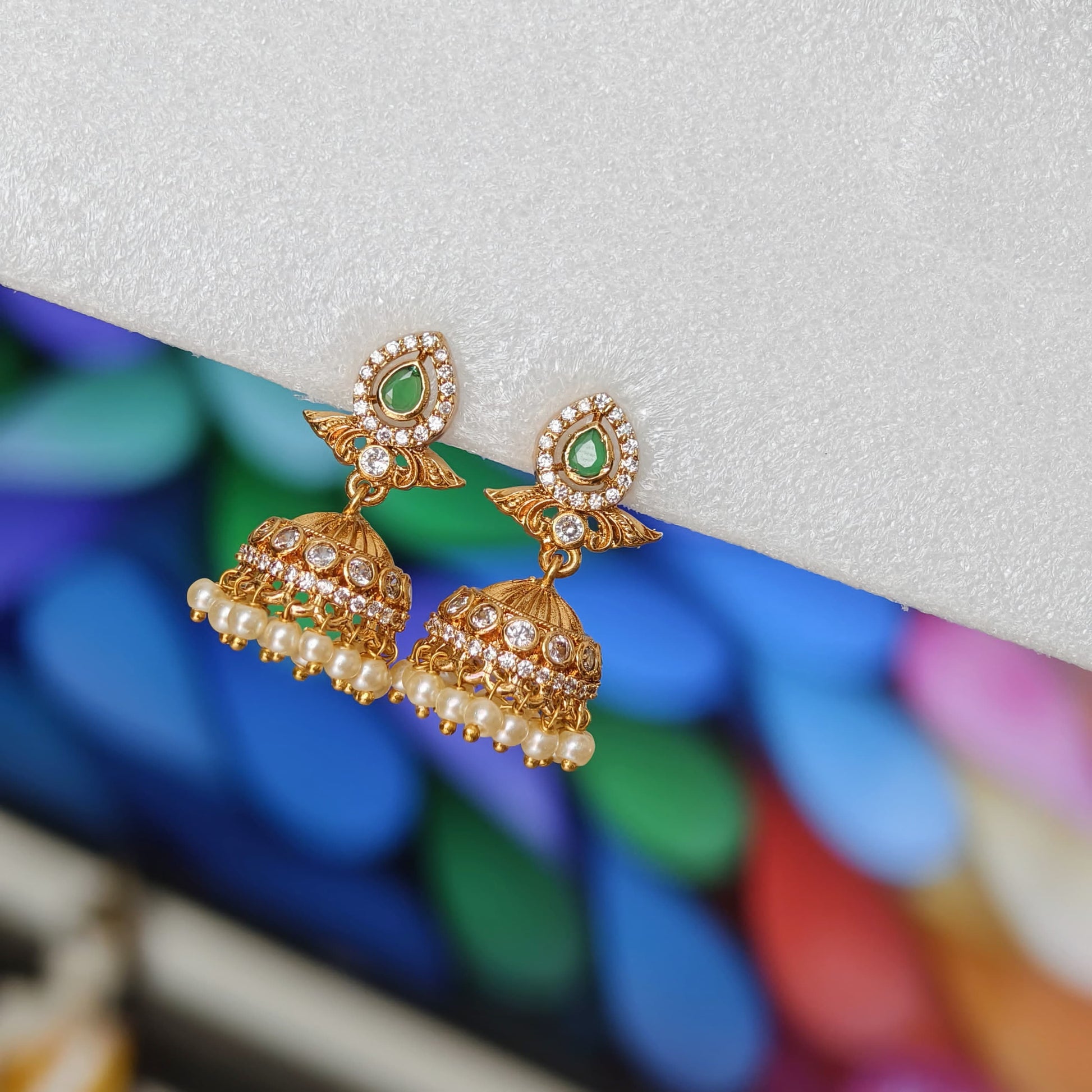 Beautiful medium size small butta earrings.green and White stone combination with pearl hangings.for functions and parties.