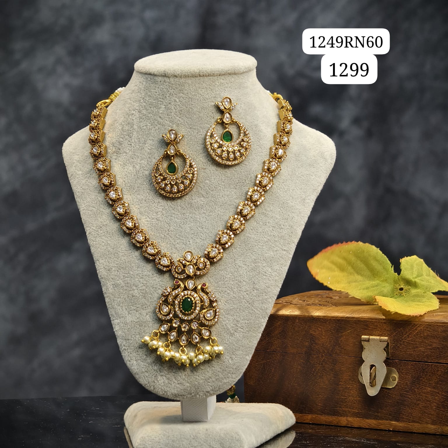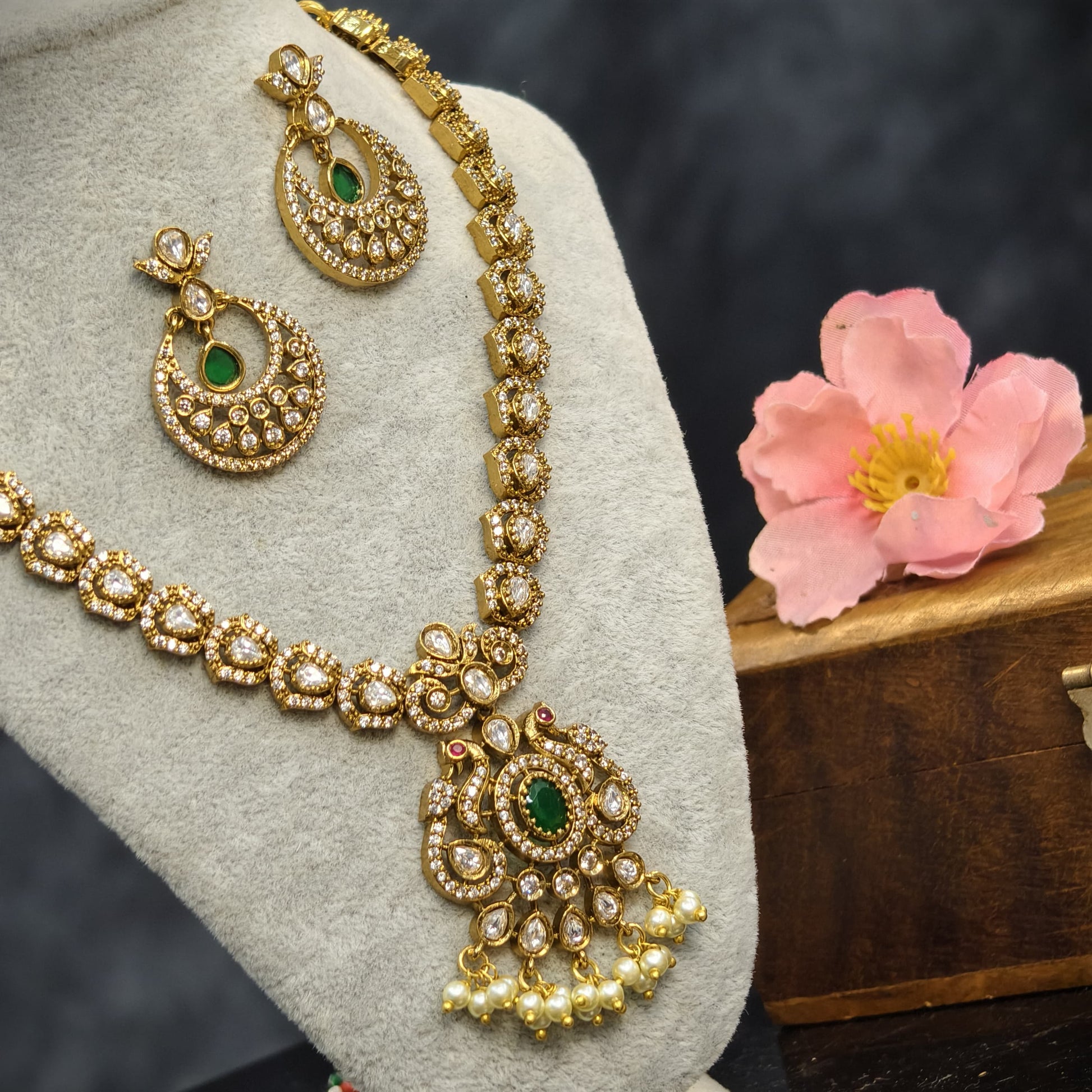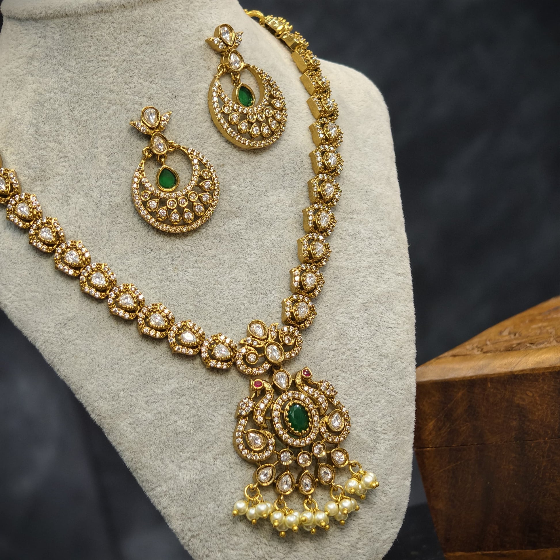 Green stone short neckset with earrings.for parties and functions.