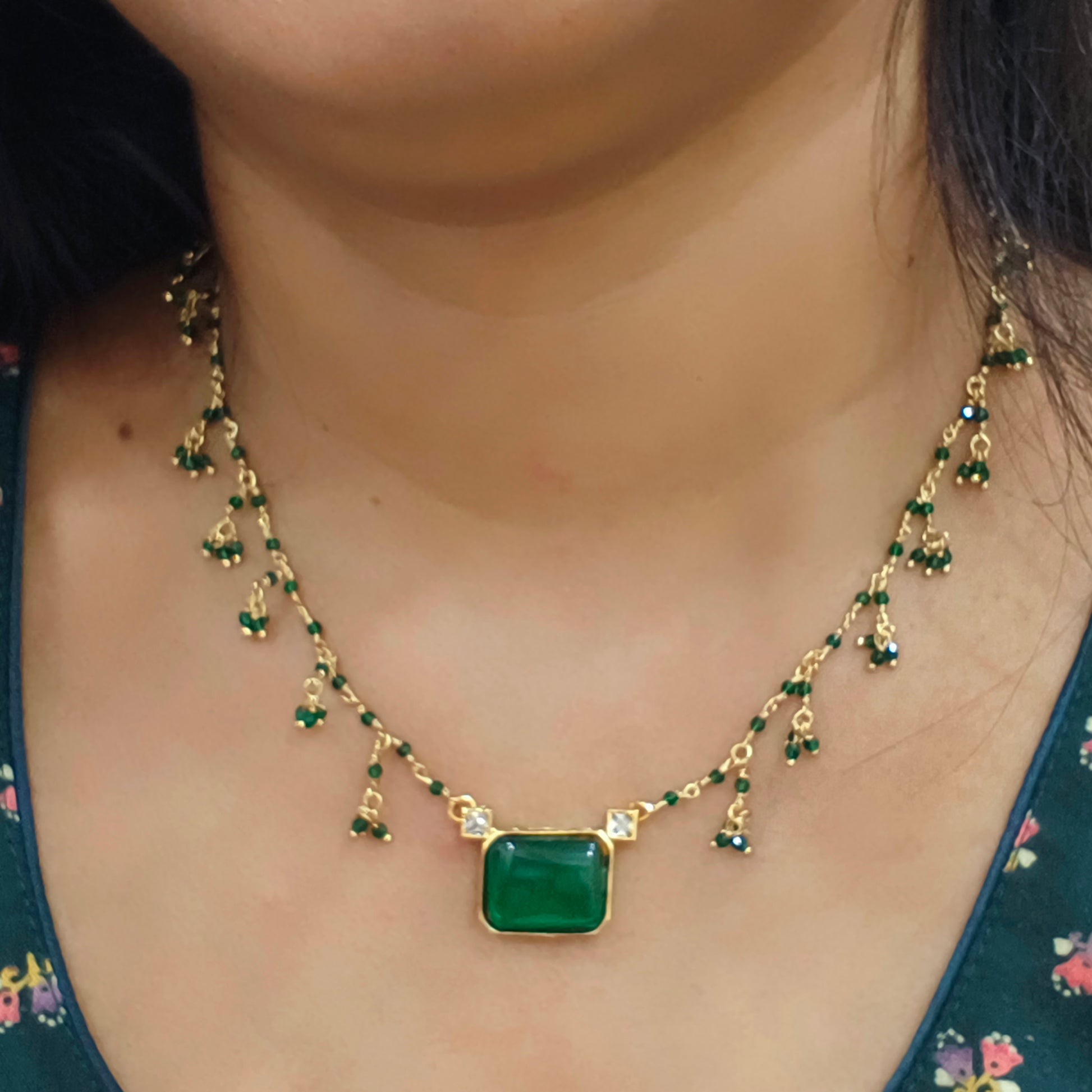 Green stone pendant with green beads chain handmade collection. 16 inches length