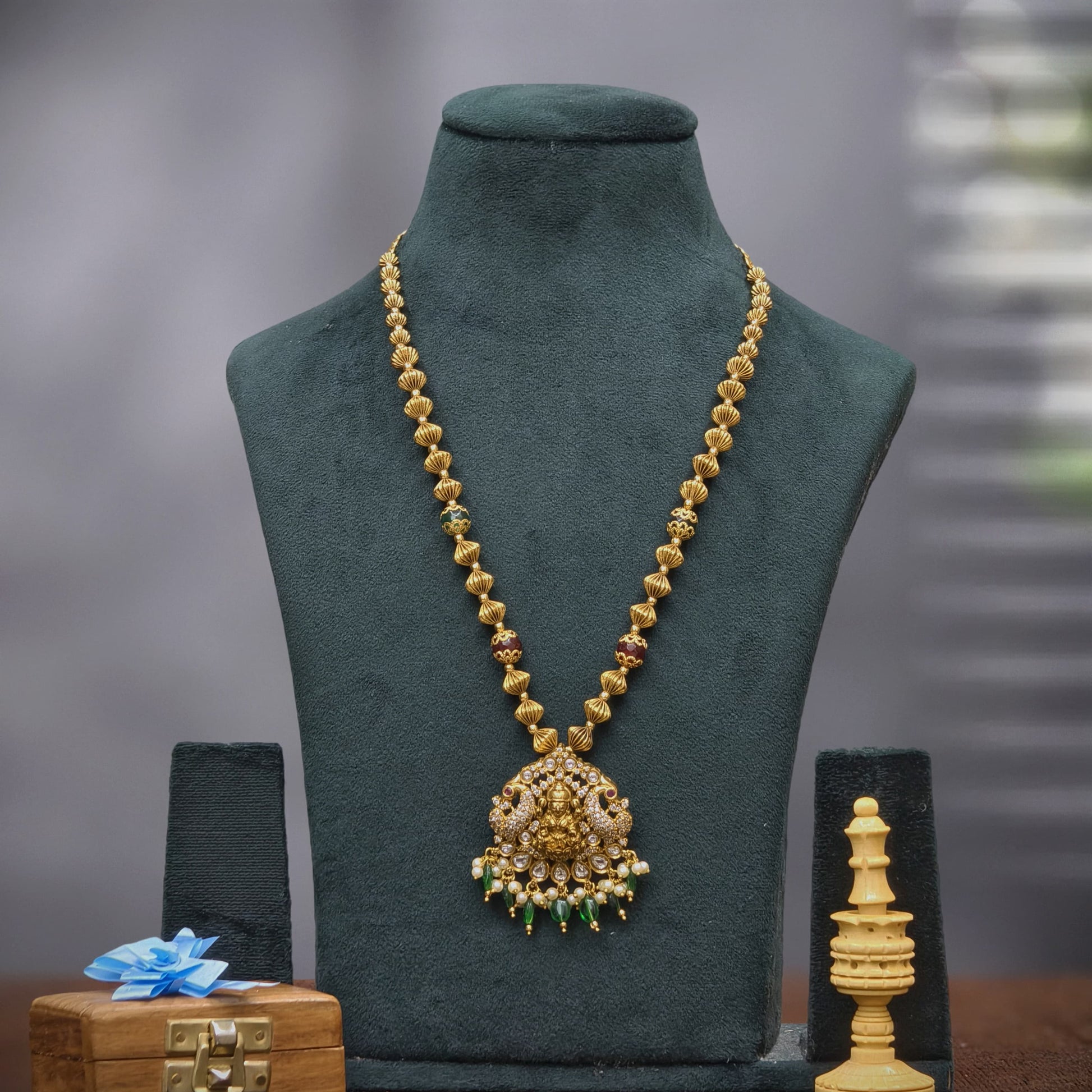 Gundla mala with Laxmi pendant along with white and green beads combination.