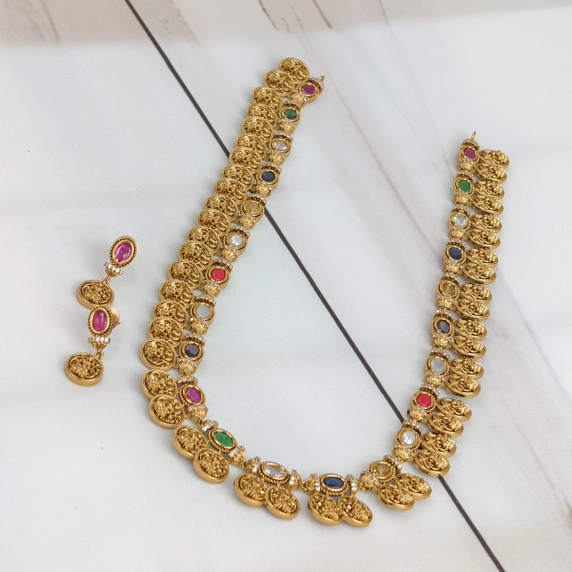 Beautiful long Kasu haram with multi colour stones and with earrings.For weddings and functions.traditional wear.