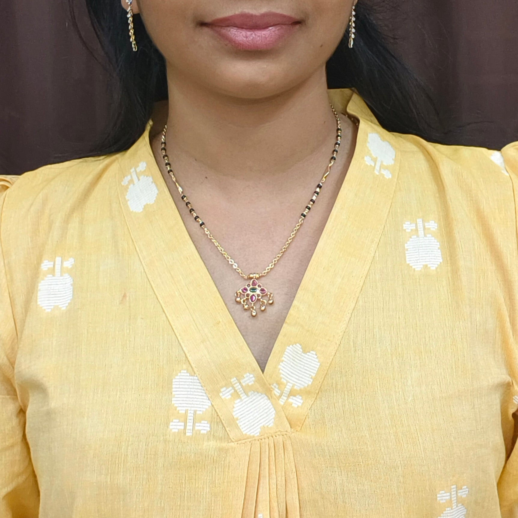 Short black beads with kempu doller in micro gold plated in the length of 16 inches .