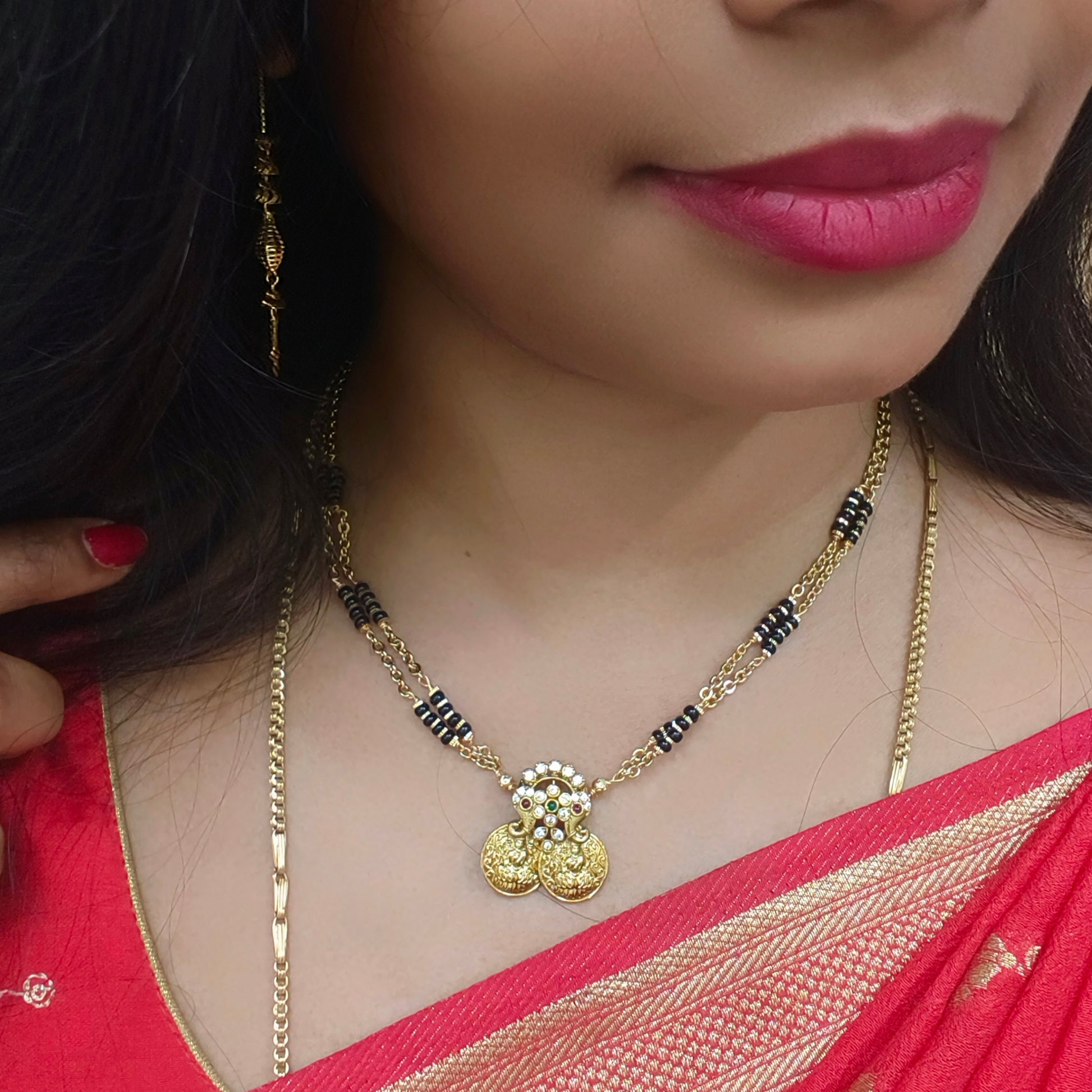 16 inches short daily wear mangalsutra. Nakshi metal pendant microgold plated chain used.wear this Short imitation mangalsutra to look your best at any occasion