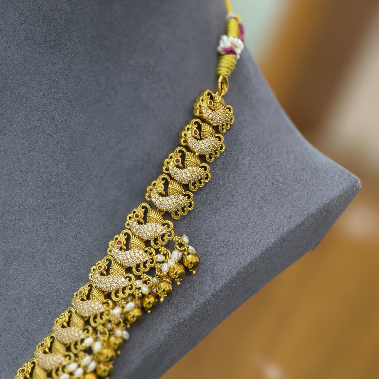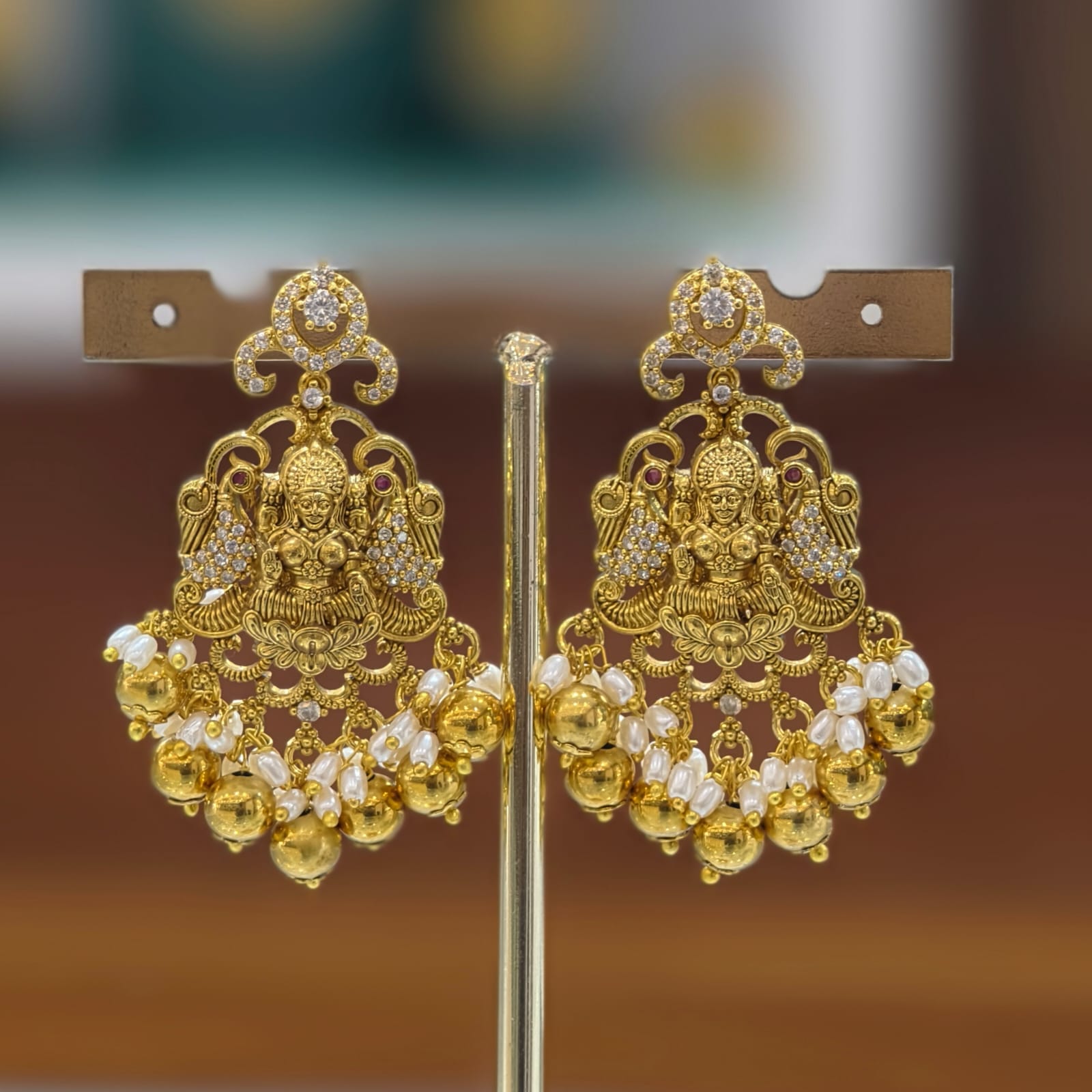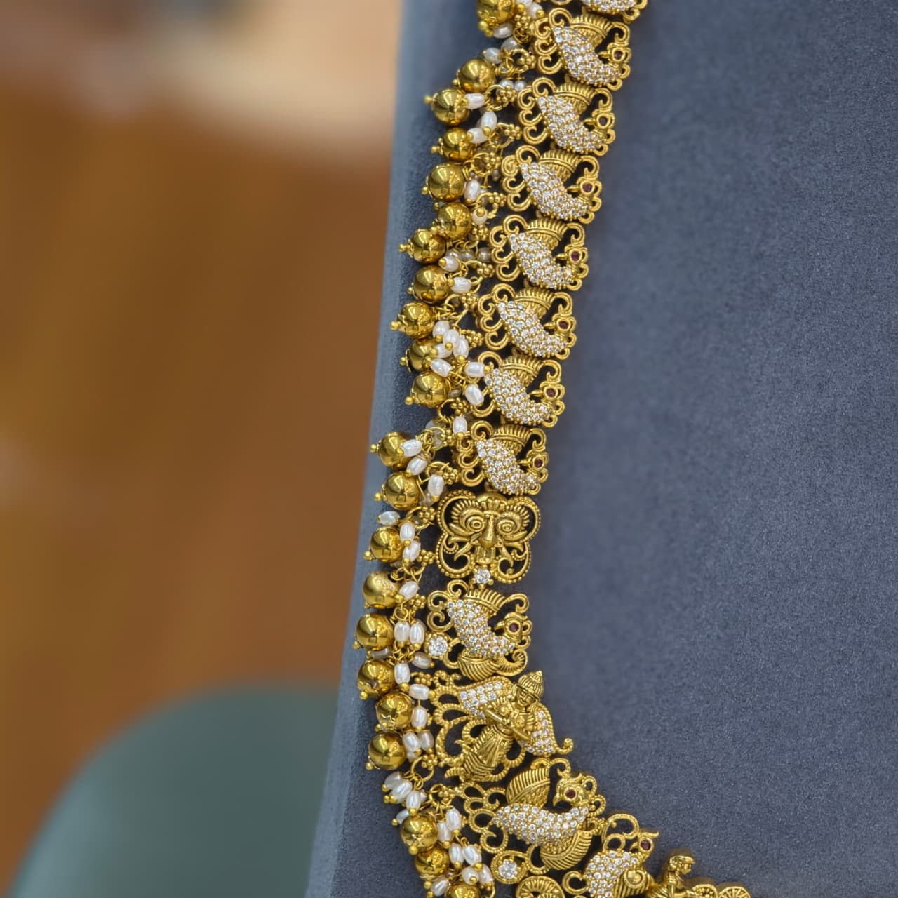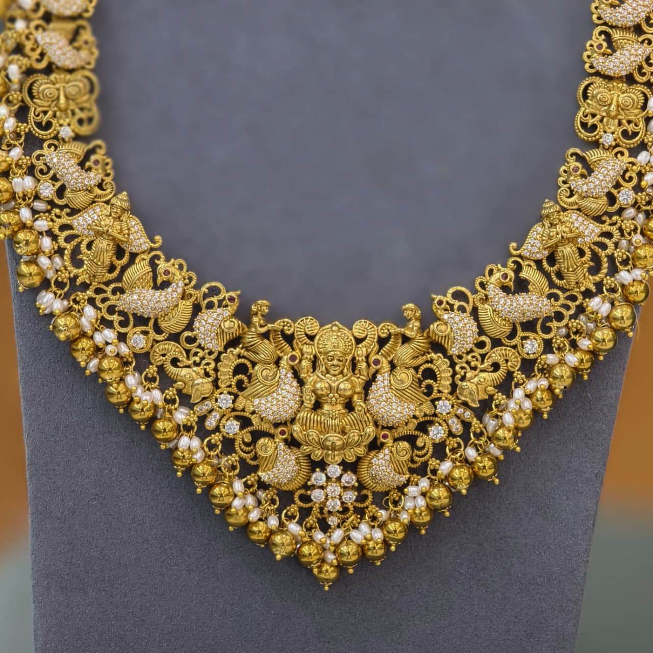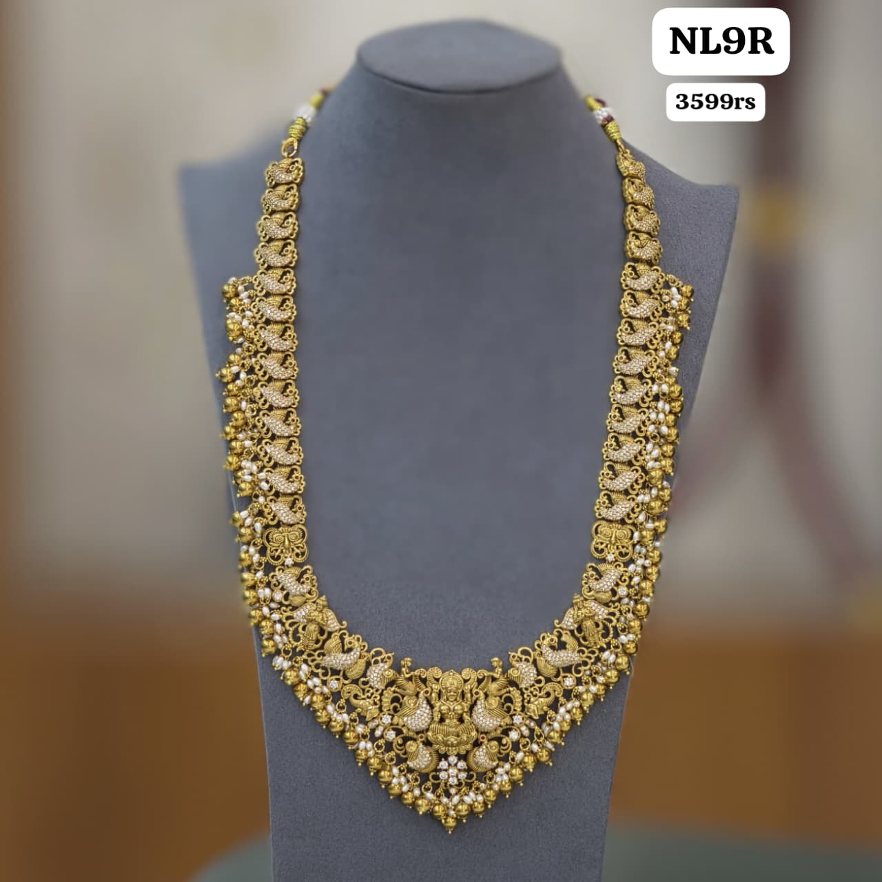 Elegant Lakshmi Long Haram crafted with intricate antique finish and delicate stone detailing.A perfect traditional piece to enhance bridal and festive looks with royal charm. ✨