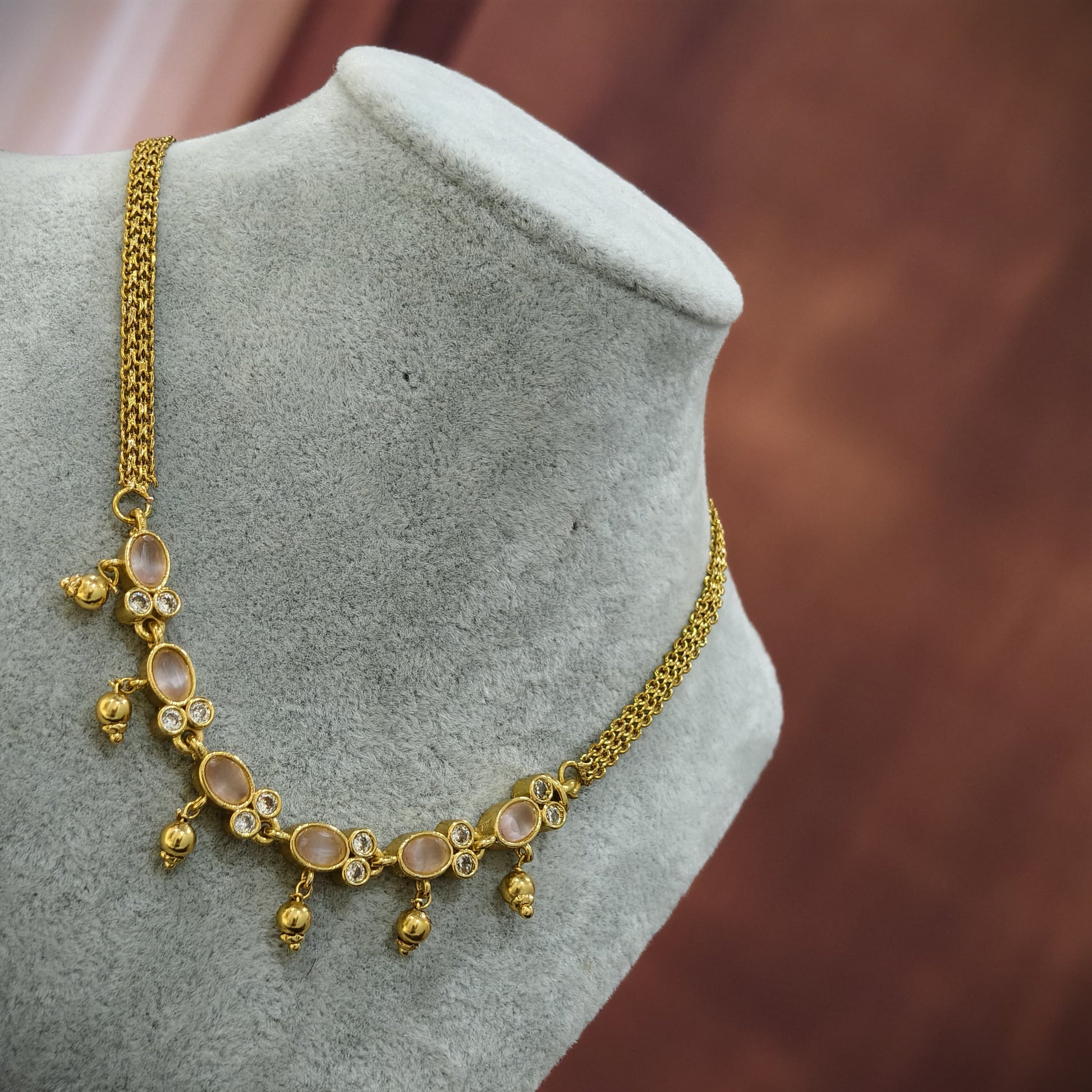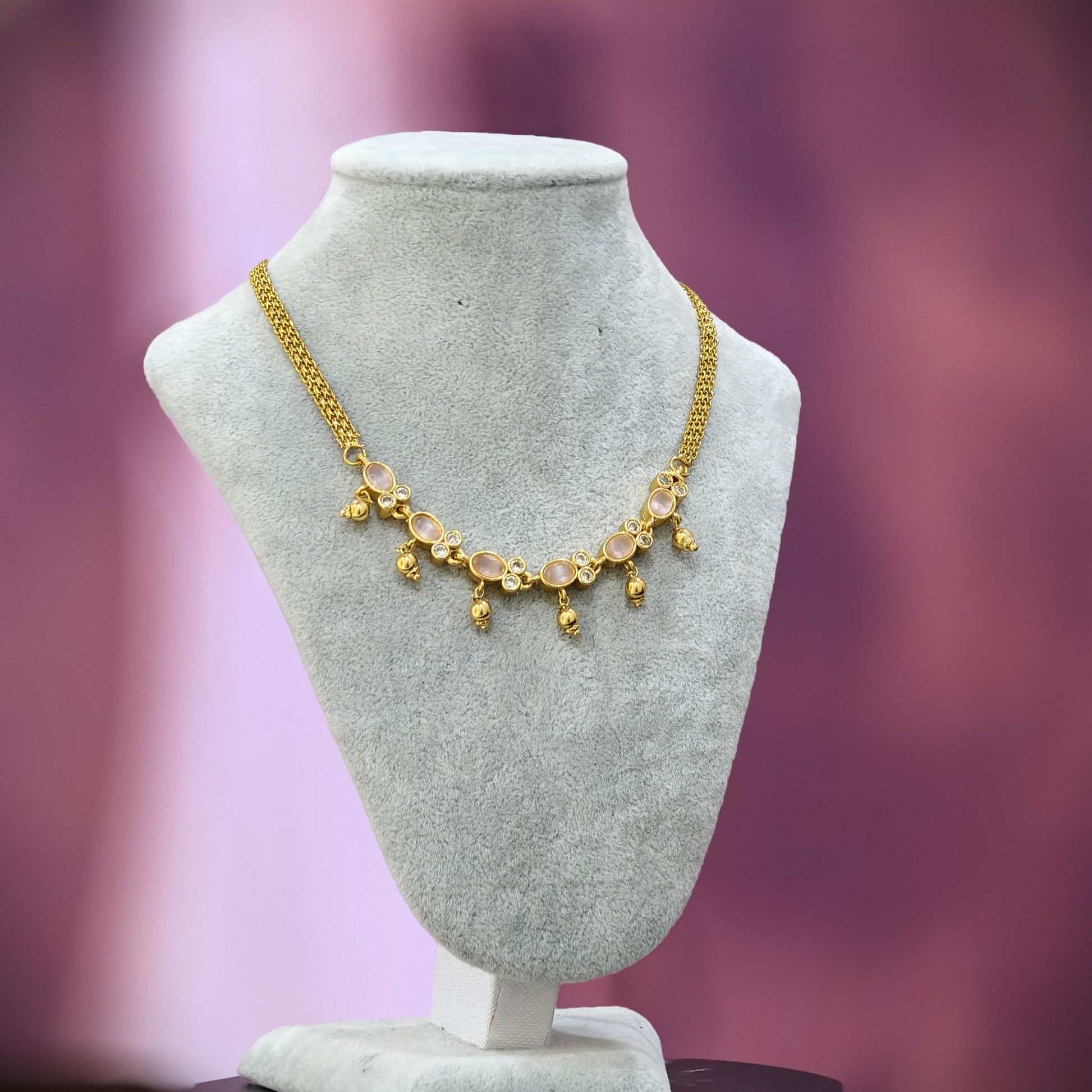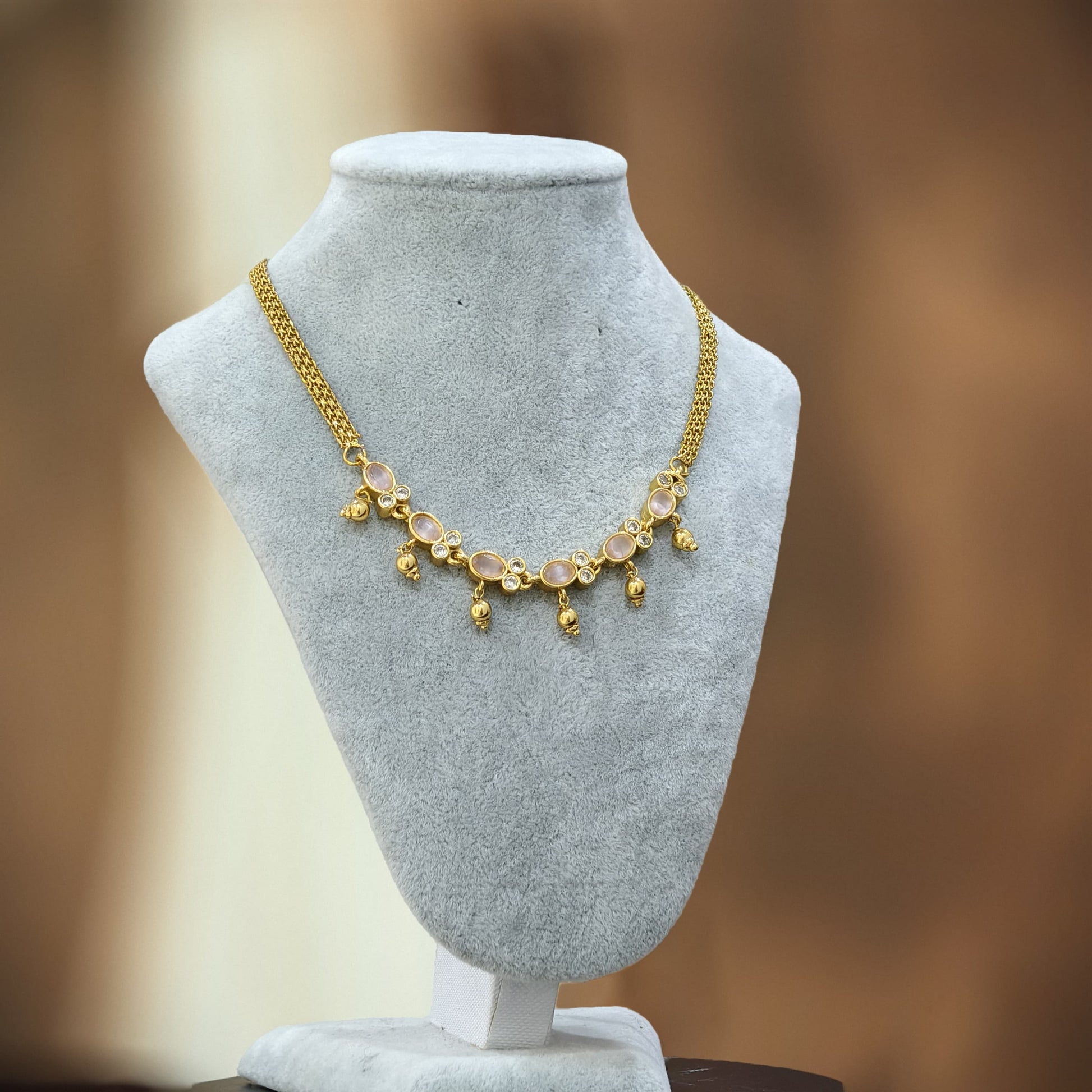 Short neck piece with light pink and white stone combination.simple and elegant look.