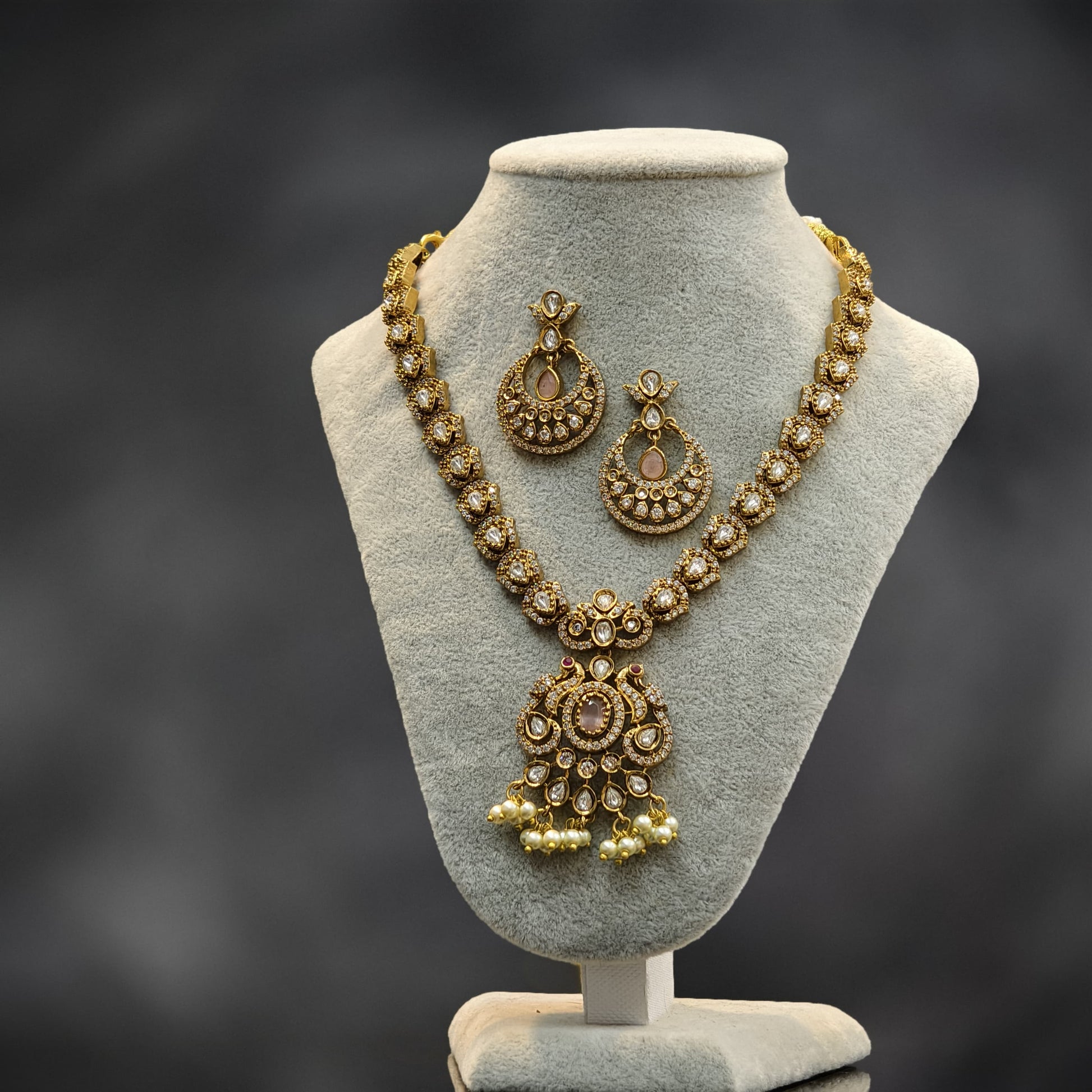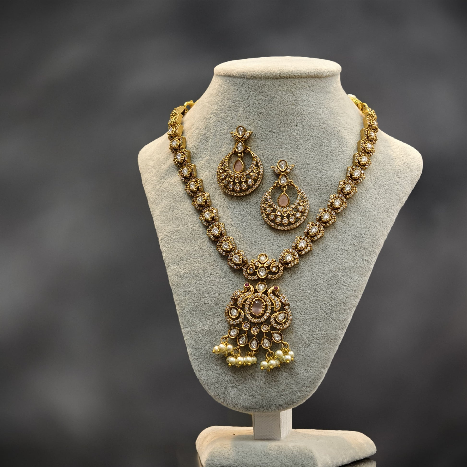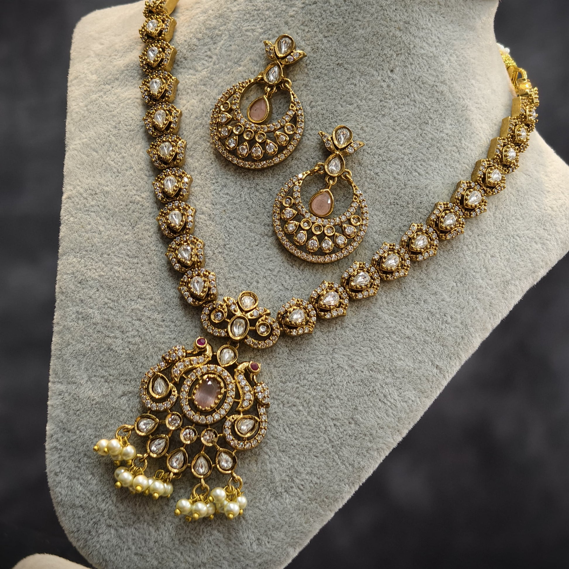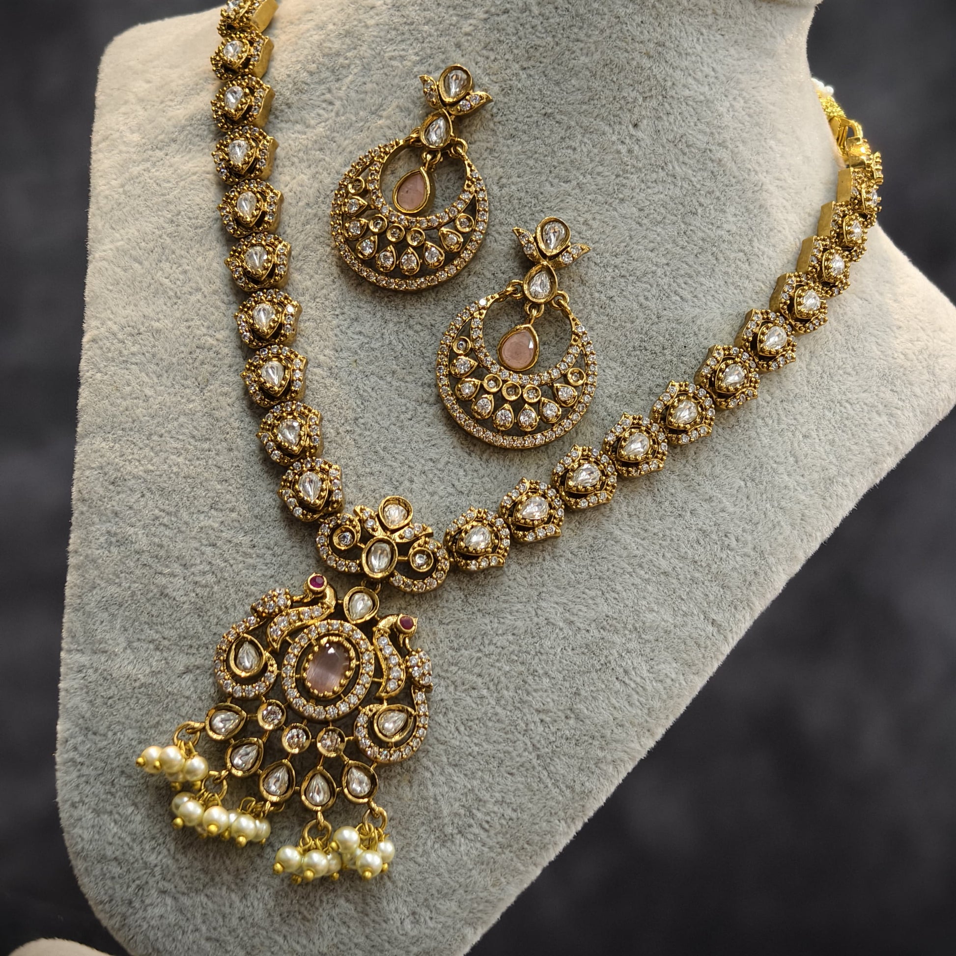 Light pink stone neck set.with earrings.peacock pattern pendant with pearl hangings.