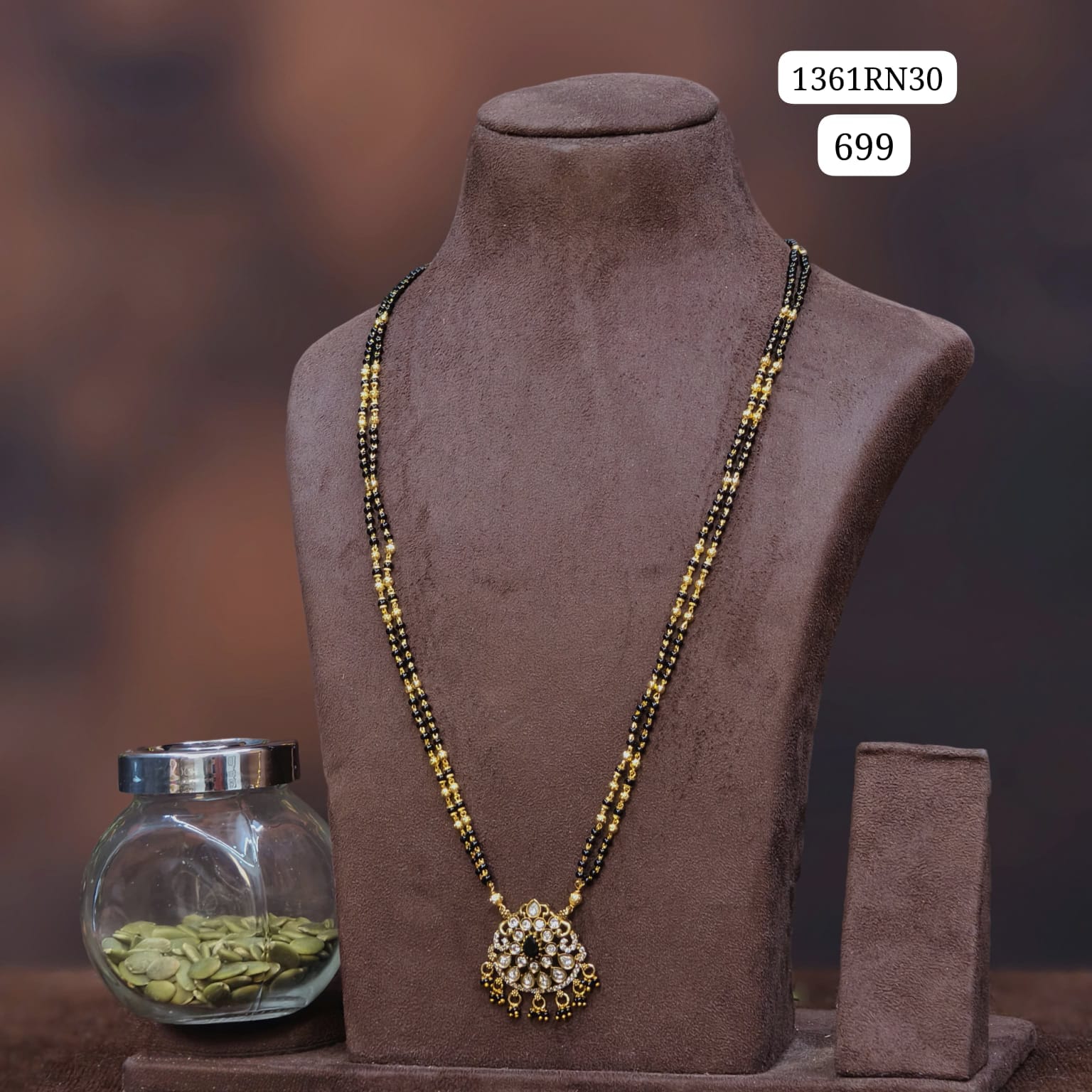 Long black beads with green stone pendant in the length from 26 to 28 Inches.traditional wear without any God motive.