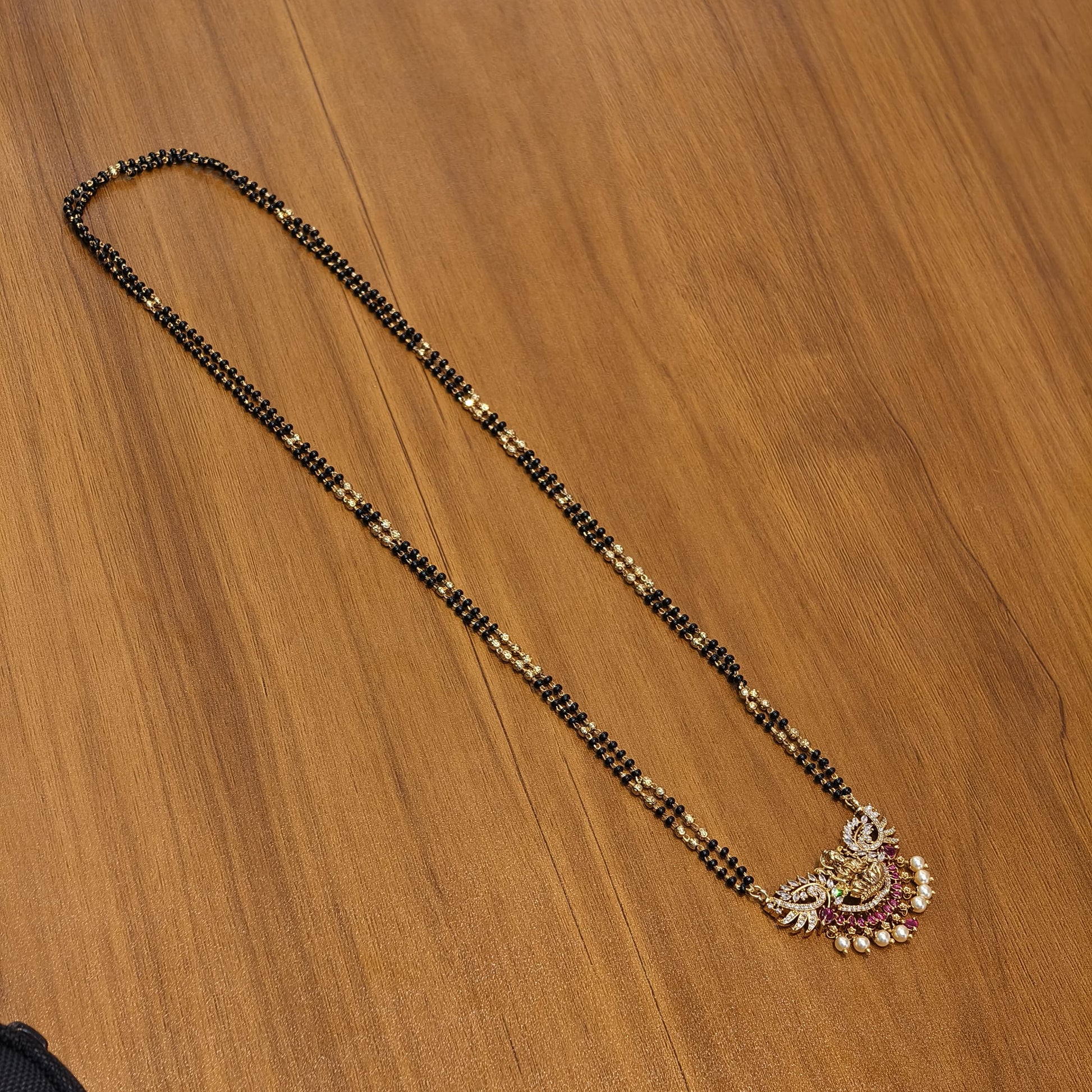 Long black beads with Laxmi pendant along with pink stones.in the length of 27 to 28 Inches.