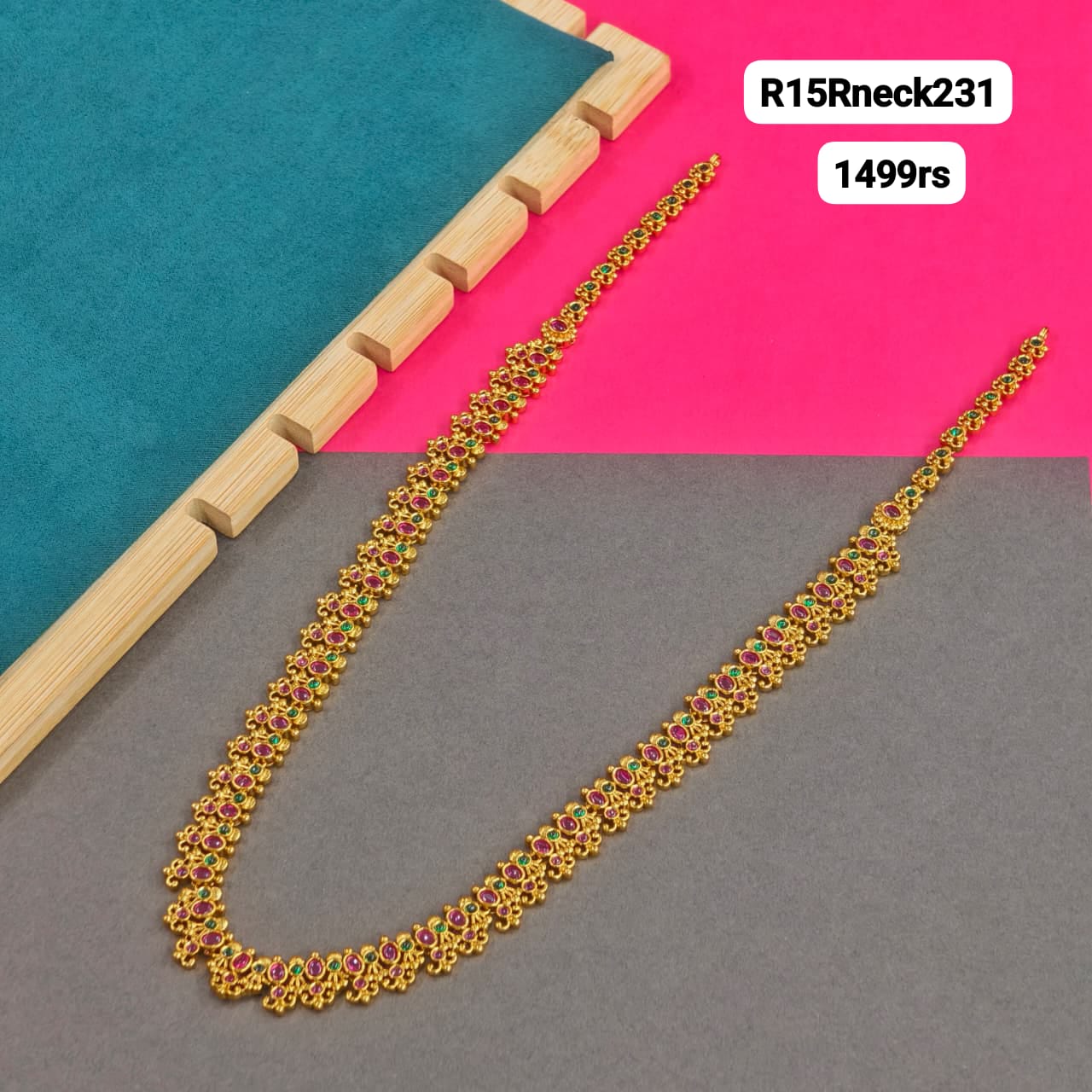 Long haram in antique finishing with real kempu and pachhala combination.