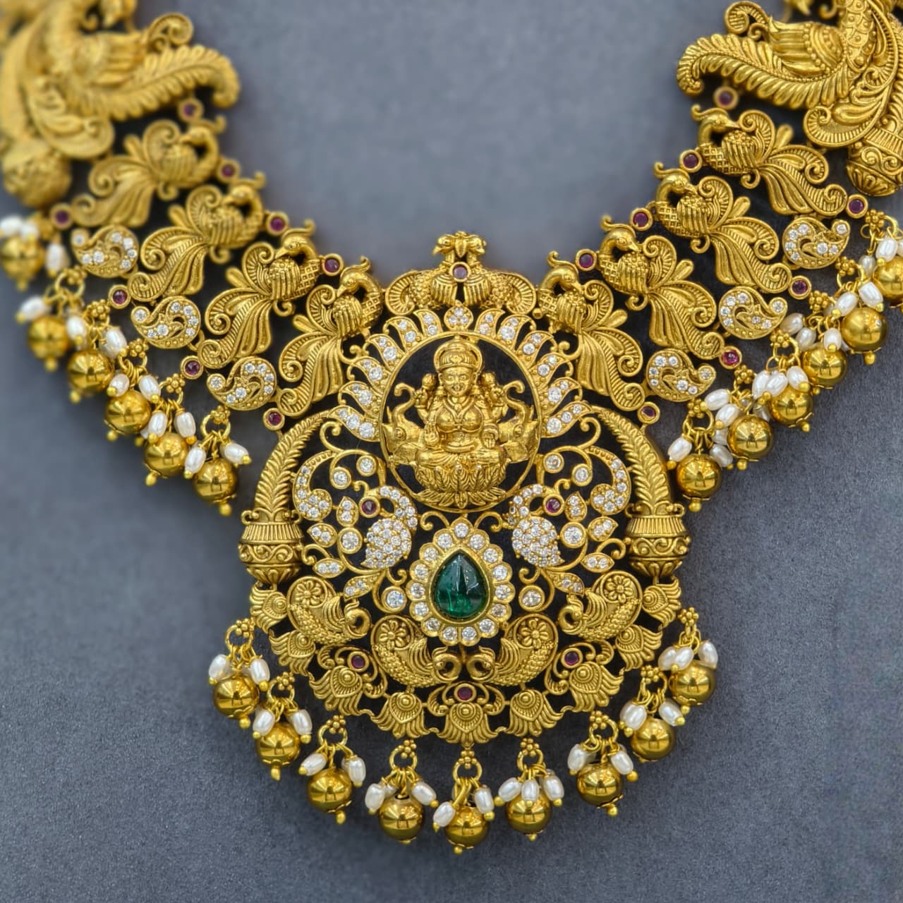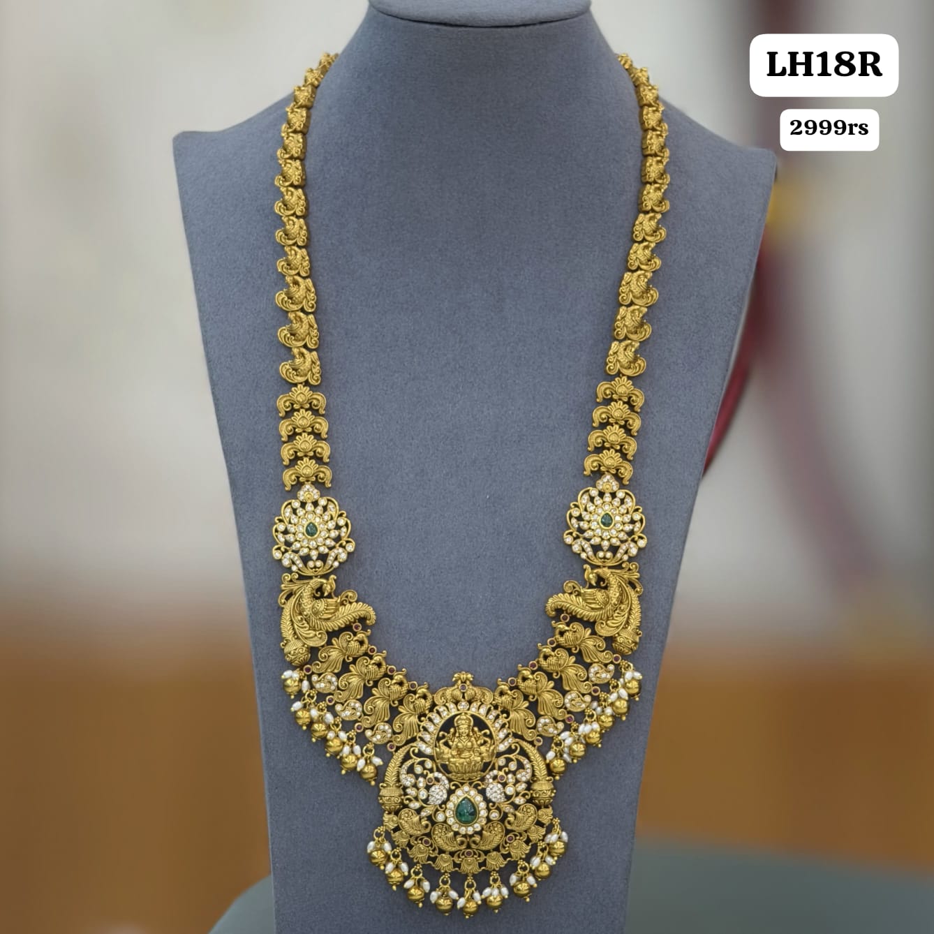 Traditional Nakshi Long Haram with beautiful Lakshmi pendant, pearl drops, and elegant antique gold finish.Perfect choice to add a rich temple look for weddings and festive occasions.