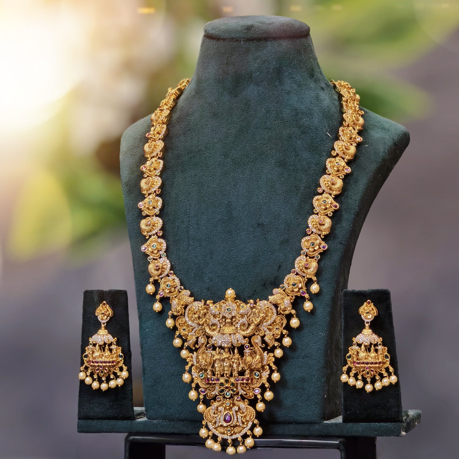 The necklace is heavily inspired by temple architecture and iconography the centerpiece features a detailed Goddess Laxmi flanked by two peacocks the neck piece in nakshi finishing.This is a traditional South Indian bridal jewelry set , specifically in the Temple jewelry style.which is known for its divine motifs and intricate craftsmanship🤩✨