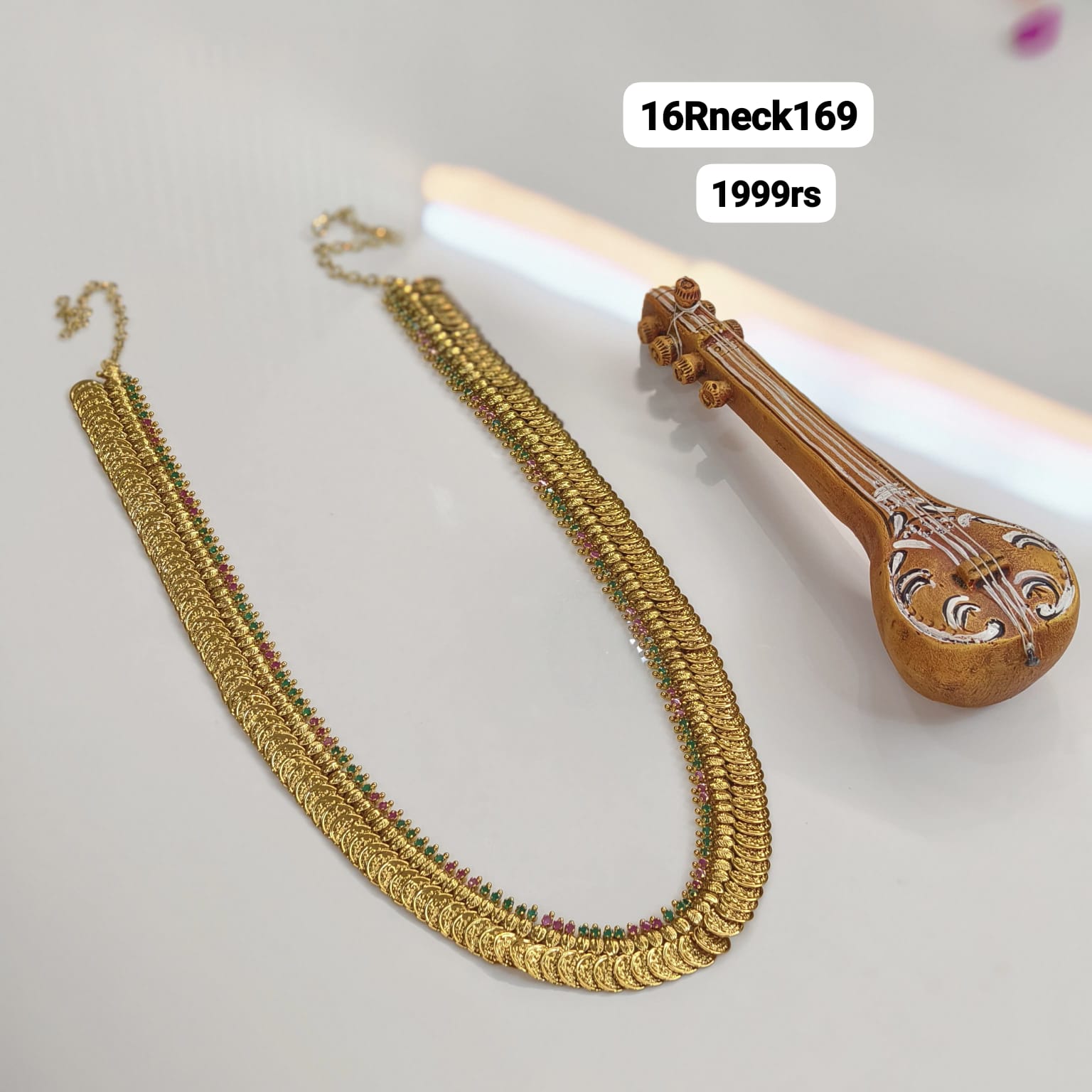 Long kasu mala for Festivals.in the length of 31 to 32 inches.in nakshi finishing along with back chain.pink and green stone combination.