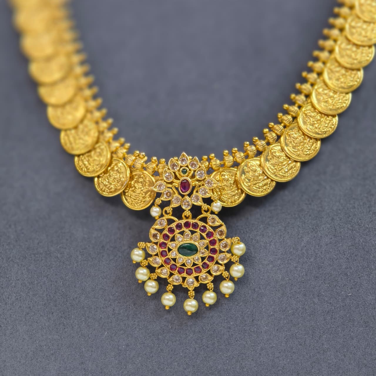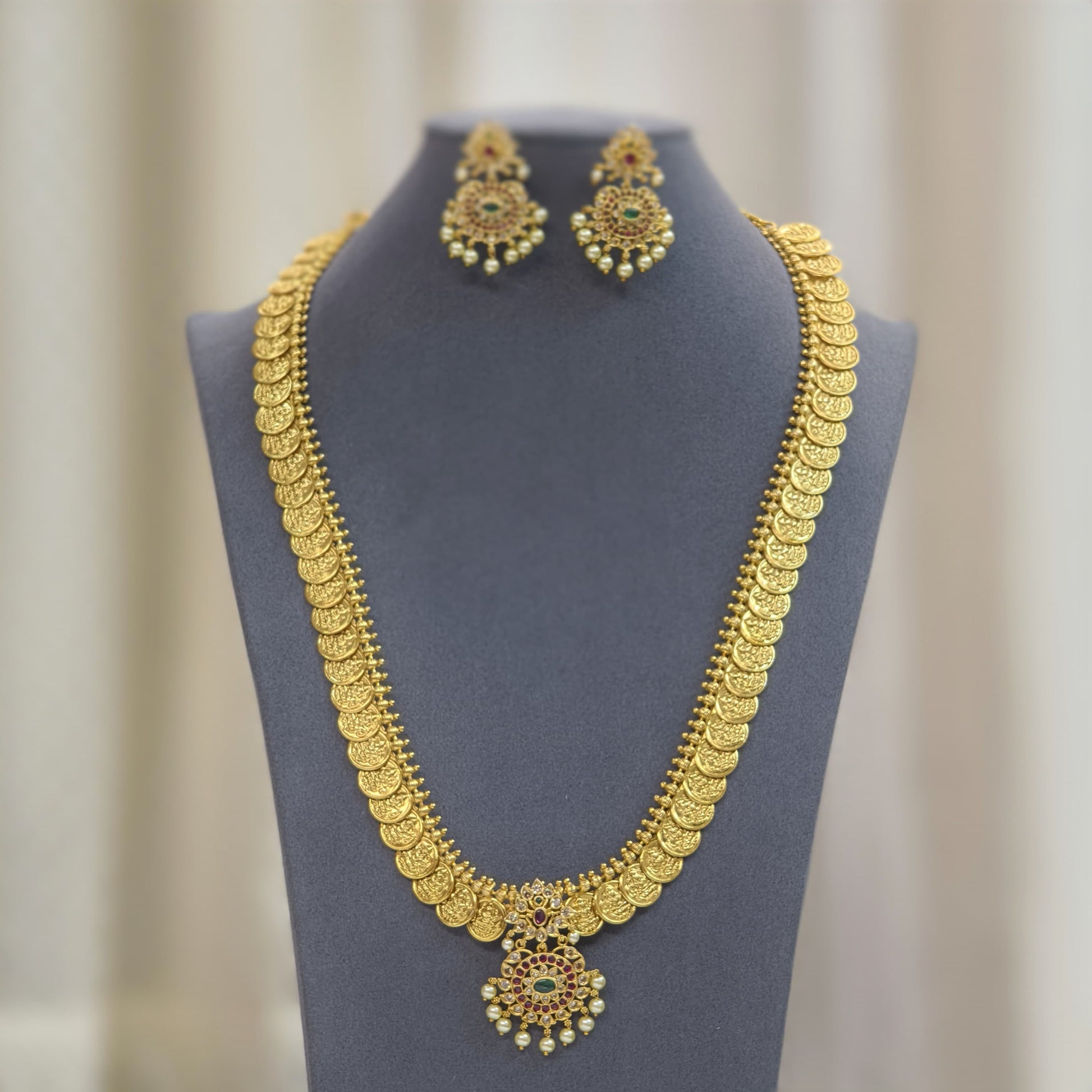 Traditional wear long kasu haram along with Earrings.budget friendly.