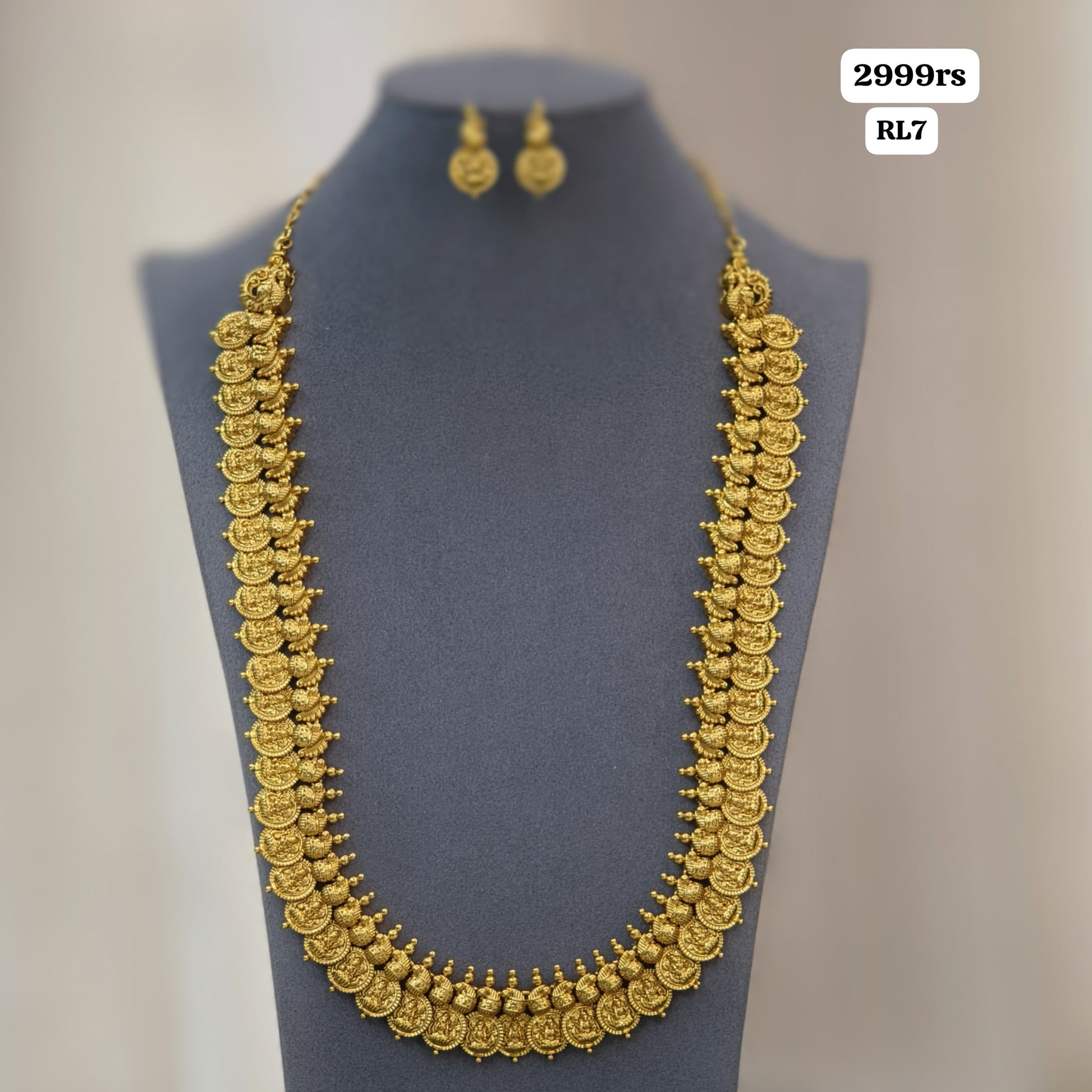 Grand temple-style long haram with rich gold finish and beautiful coin detailing.