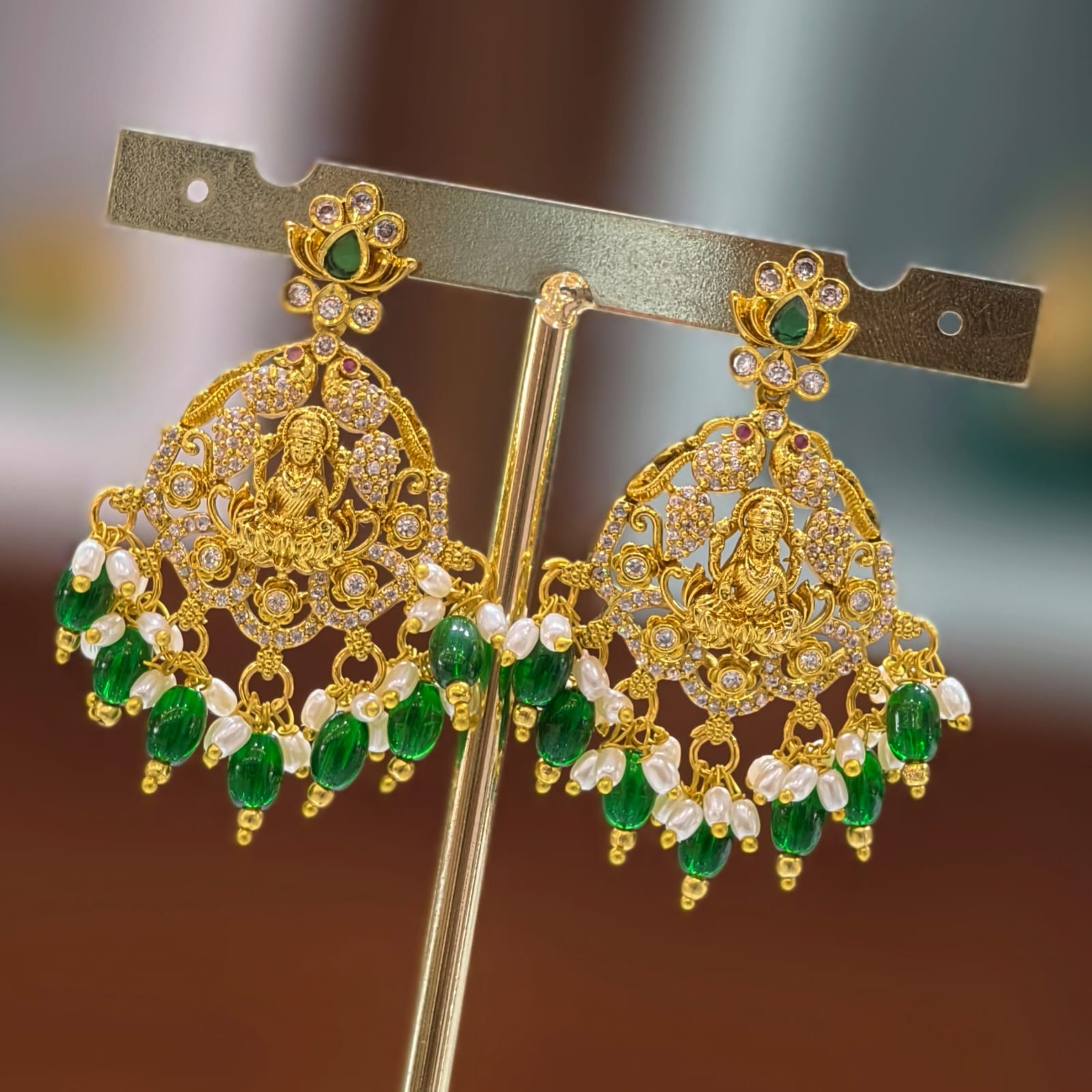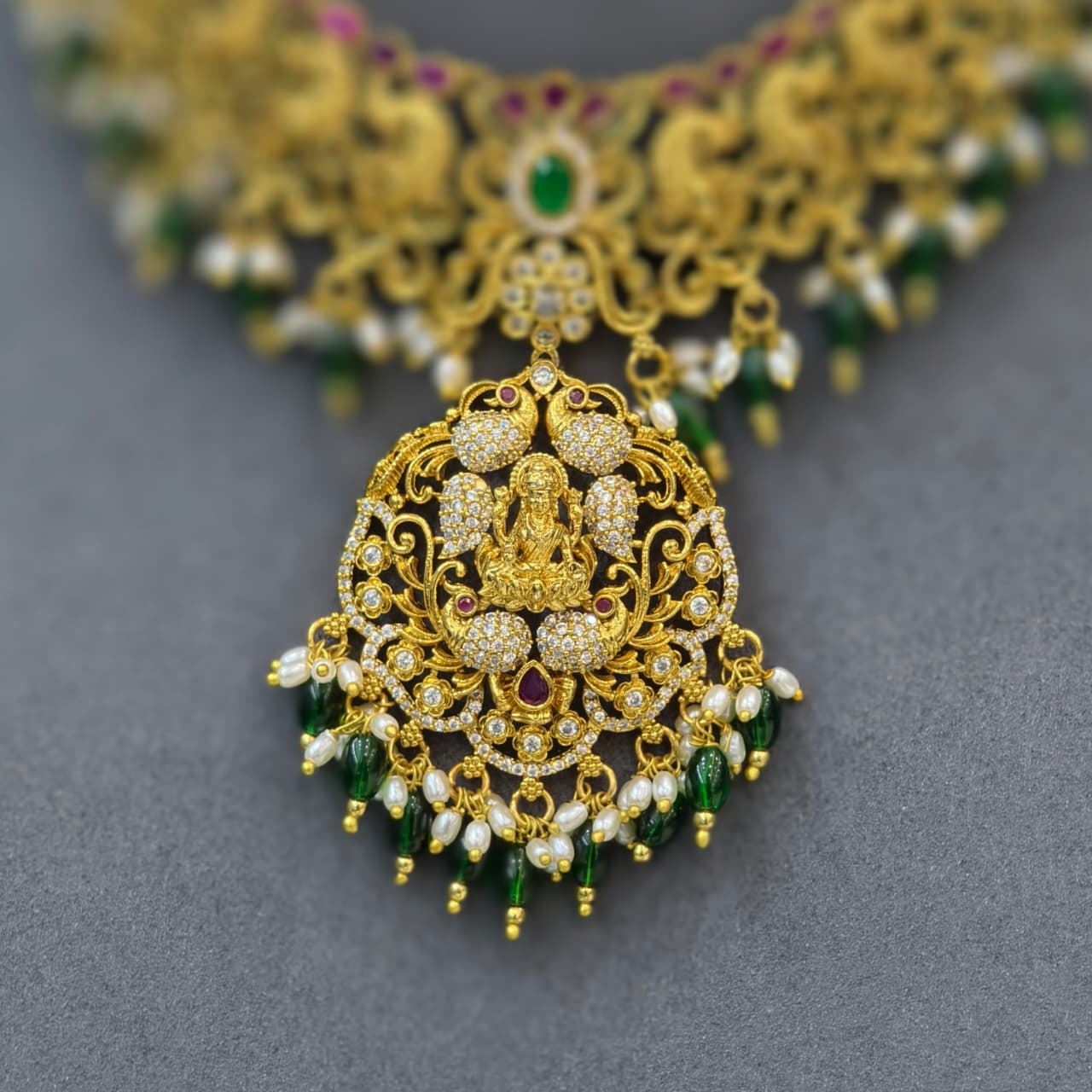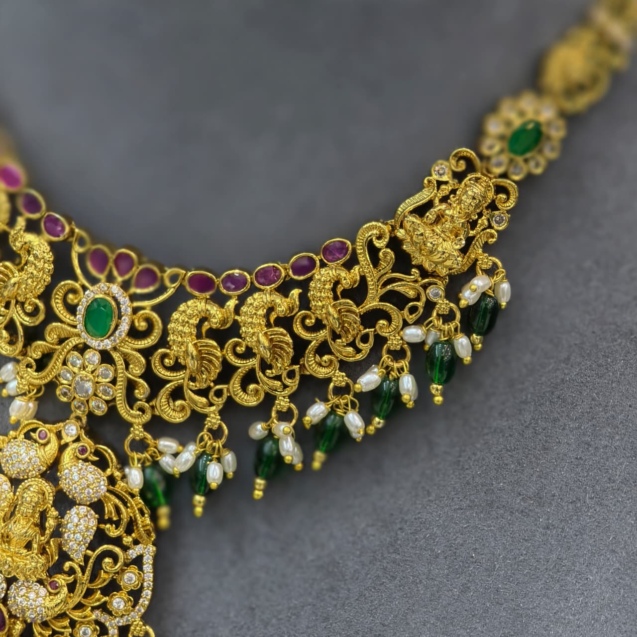 Traditional Lakshmi long haram with elegant antique finish and green stone highlights.