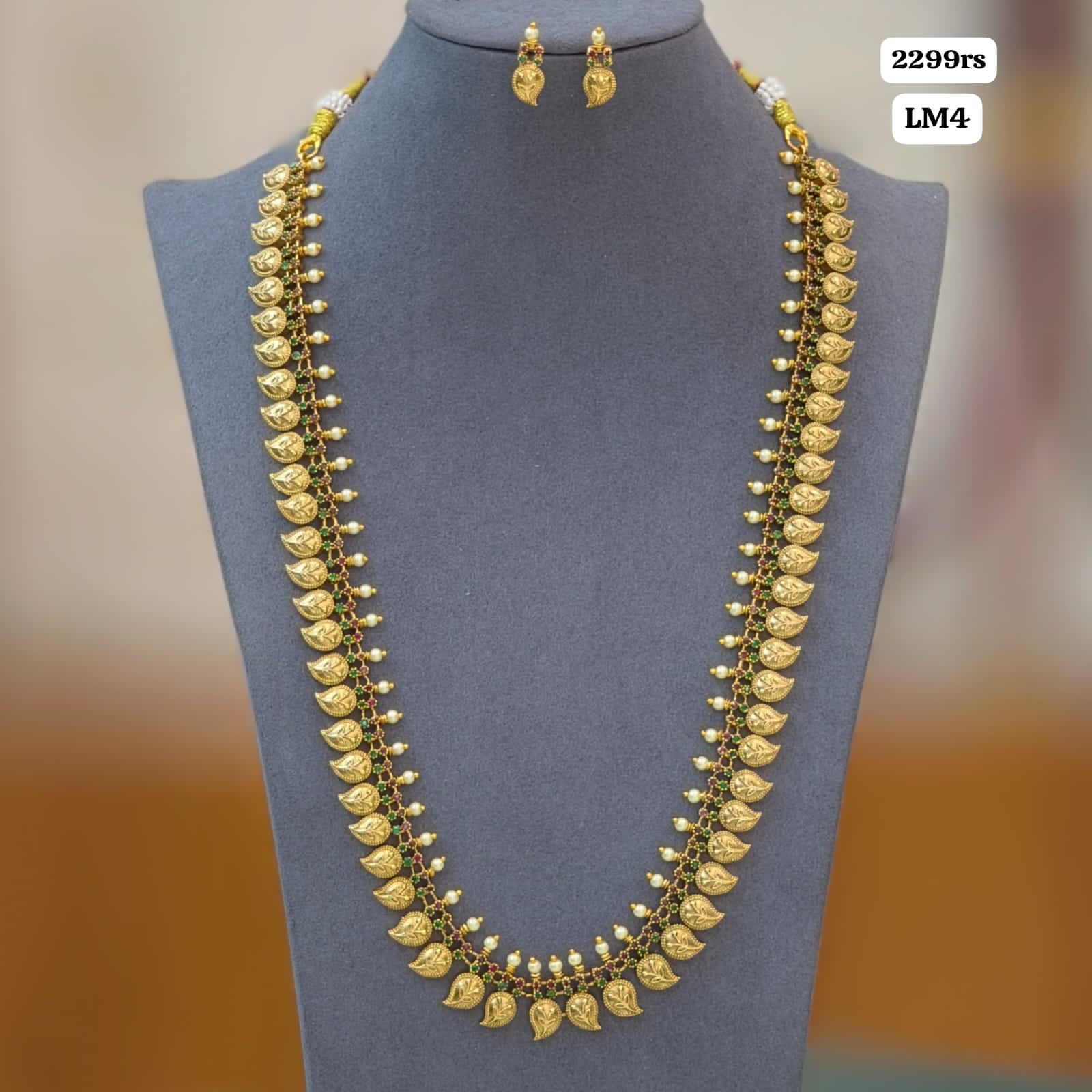 Elegant traditional leaf-design long necklace with matching earrings, perfect for festive and wedding wear. ✨