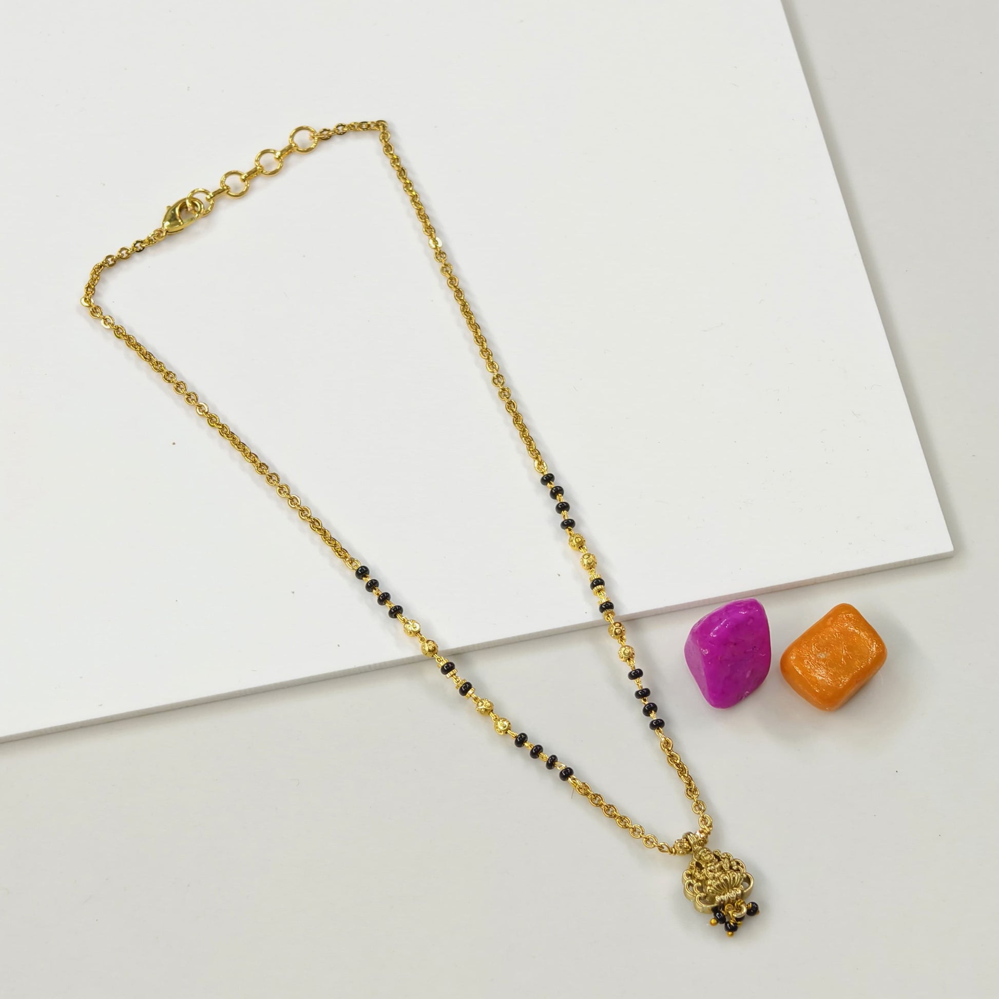 Beautiful short black beads with Laxmi pendant.traditional wear.in the length of 16 inches.