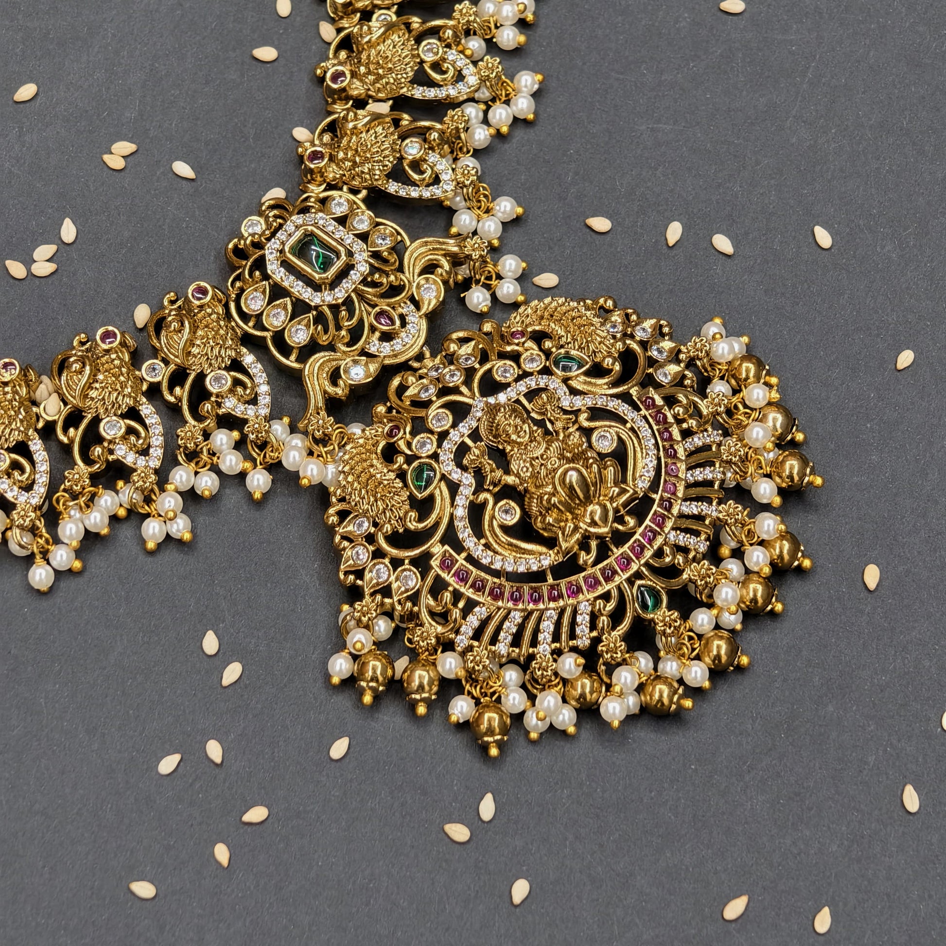π Beautiful short neckset with earrings.green and pink stone combination.with beads work.for weddings and occasions.