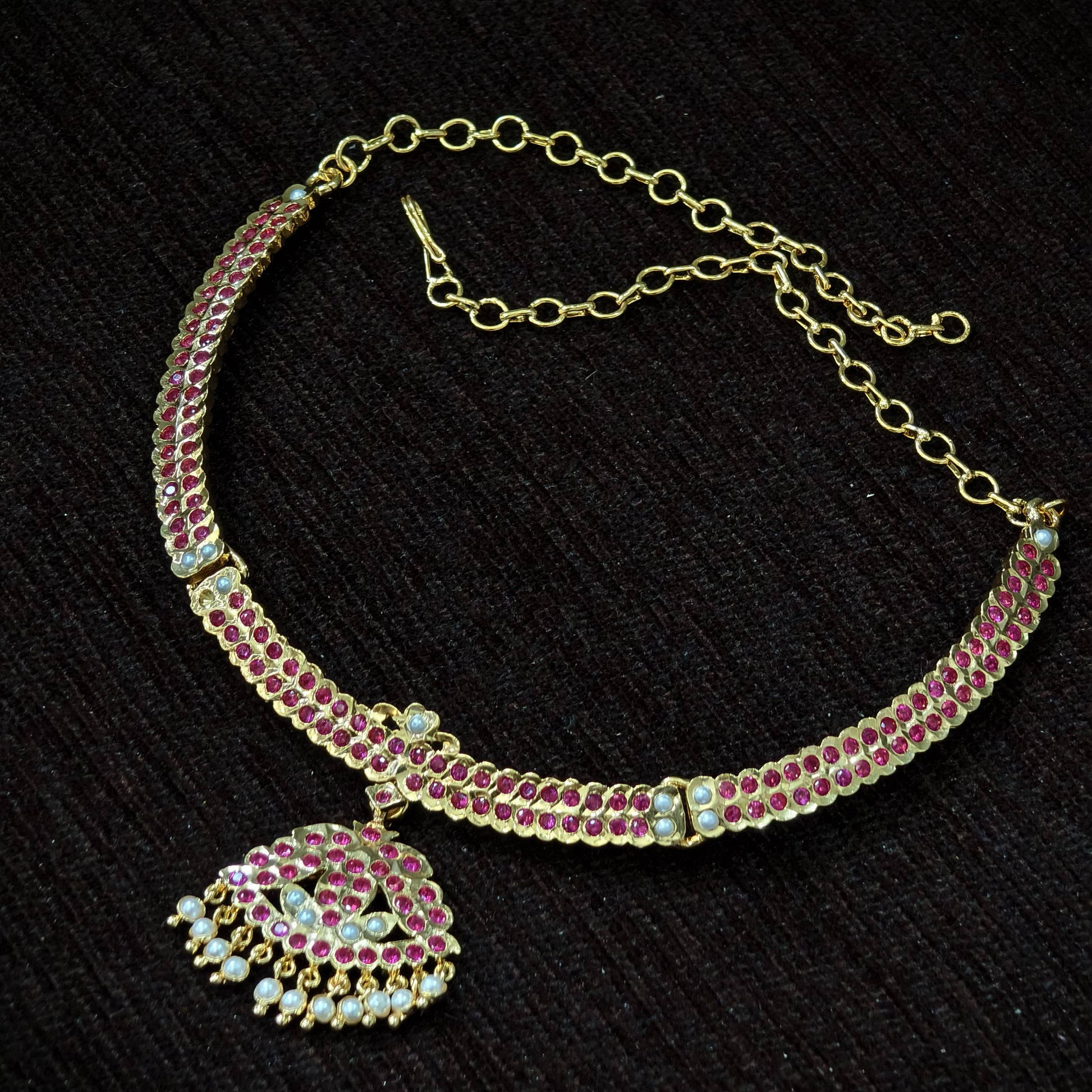 This is a beautiful traditional choker necklace featuring ruby coloured stones and pearl drops.