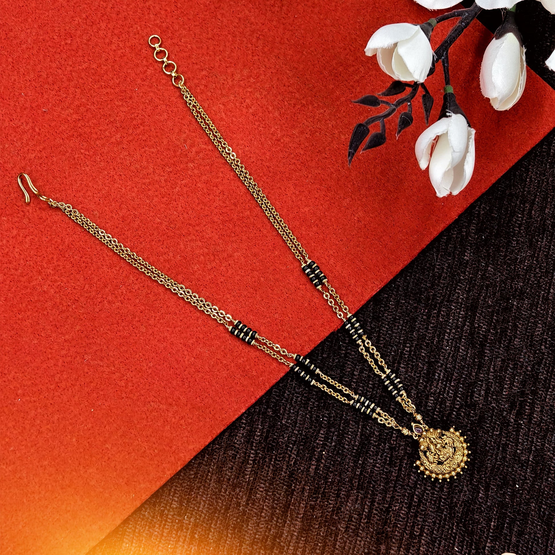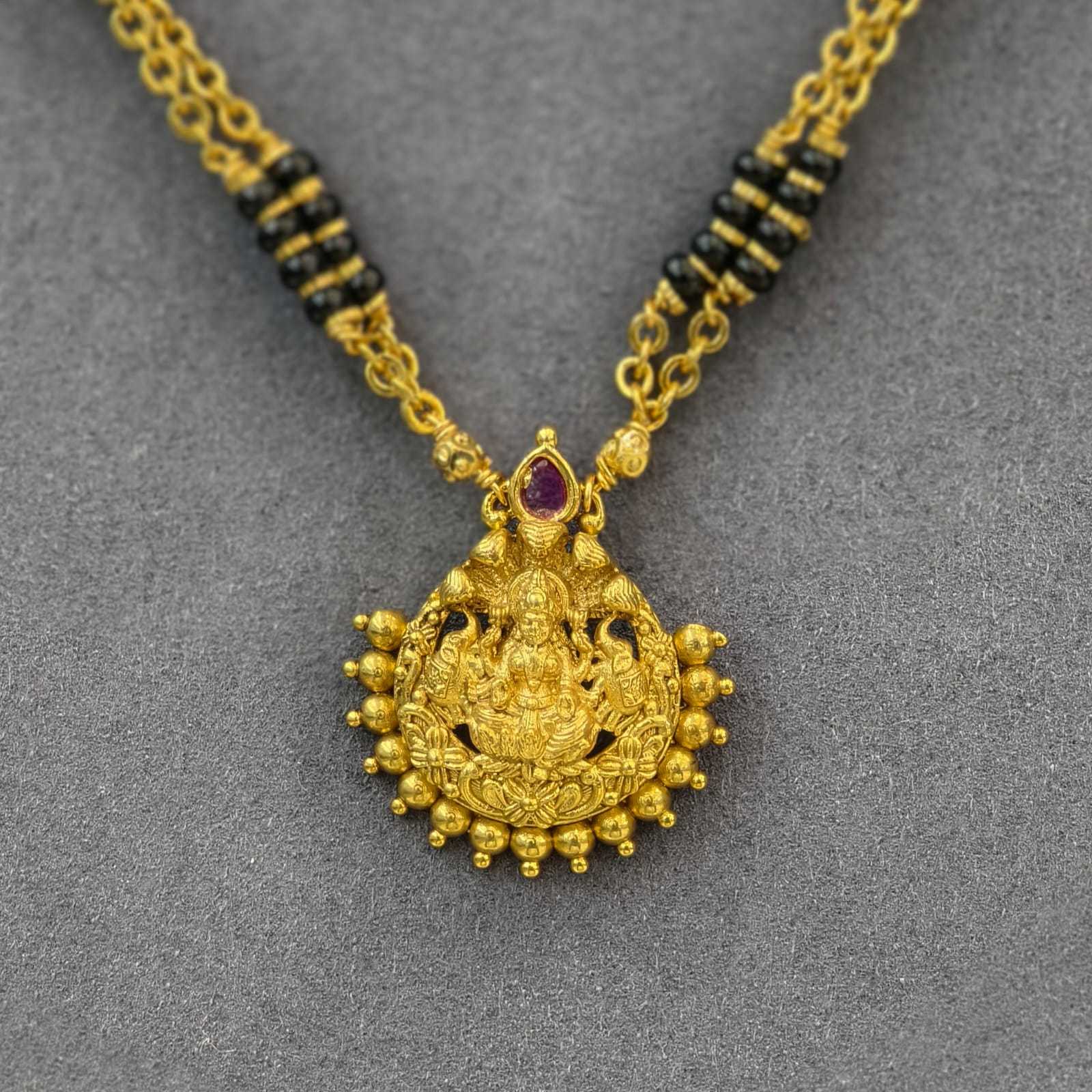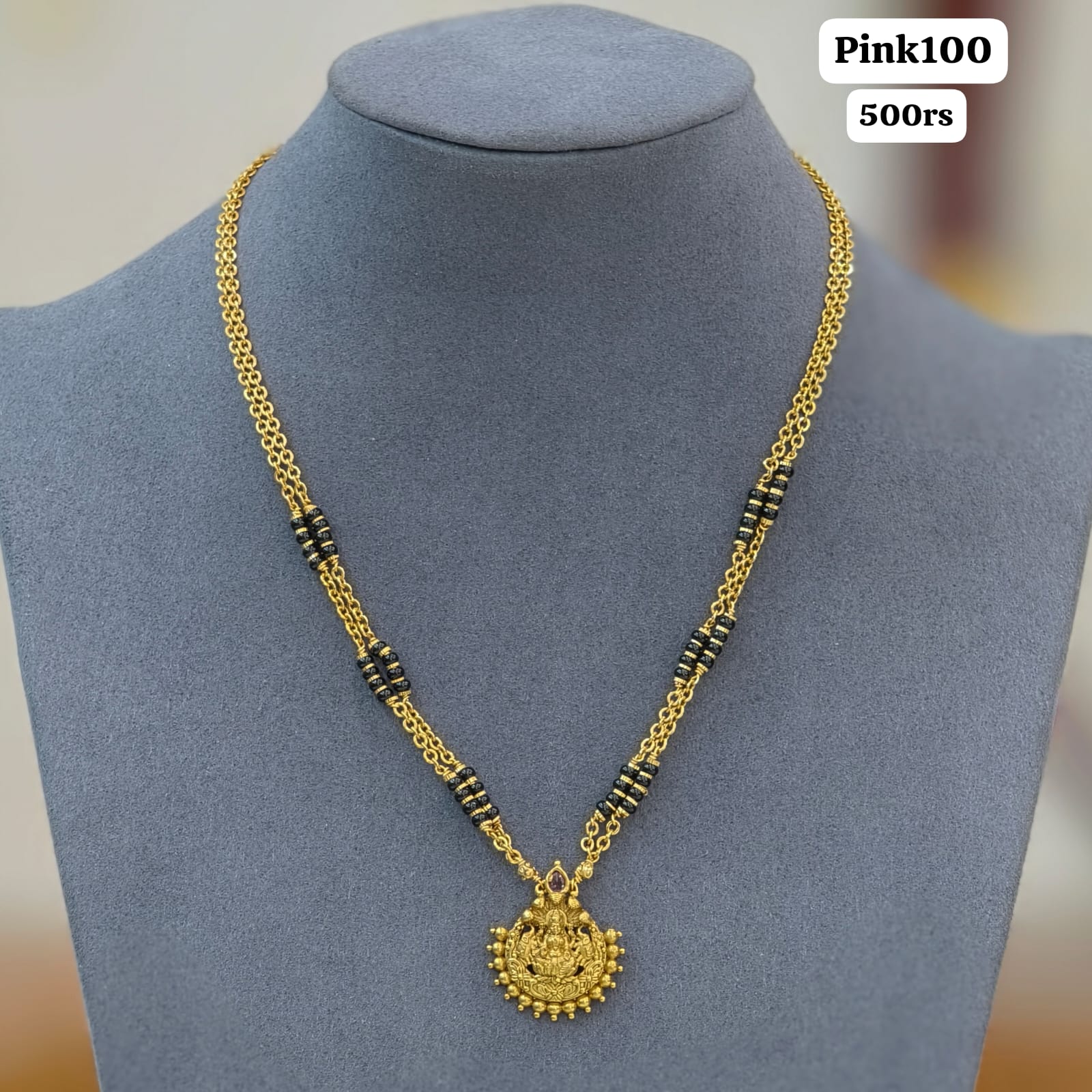 Pink stone Laxmi pendant with 2lines of black beads in the length of 16inchs.