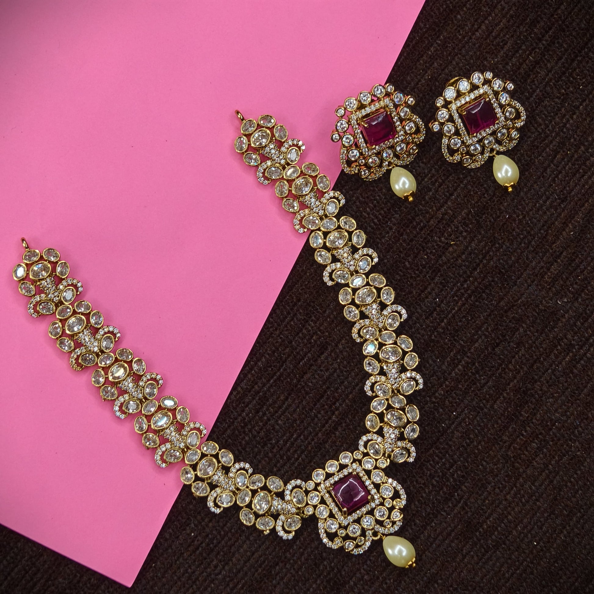 Flower pattern neck set.water uncut stones with pink stone combination.with earrings.during parties.