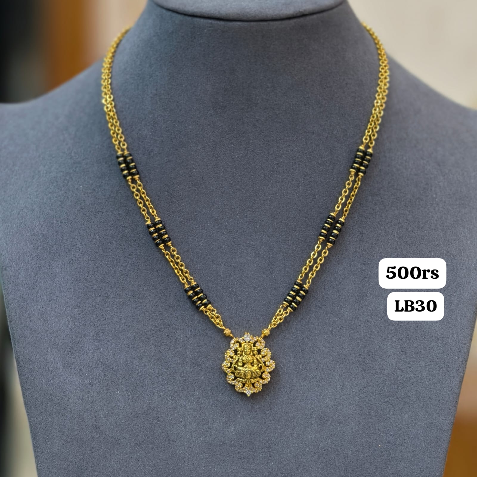 Lakshmi pendant with 2lines short black beads in 16 inches